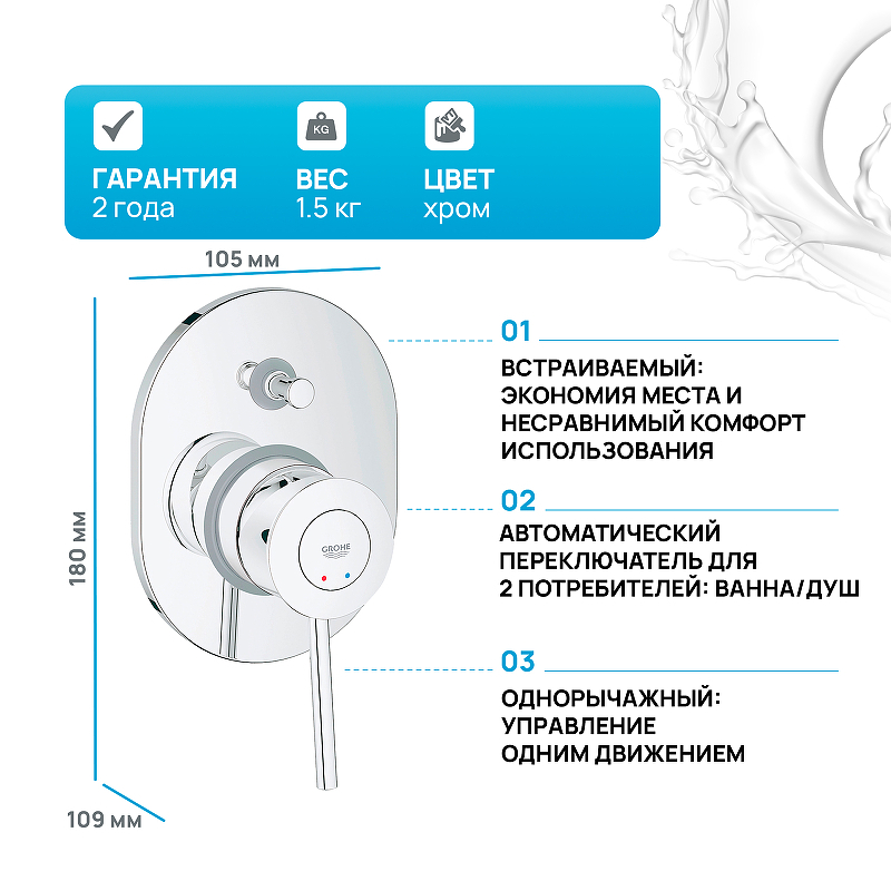 - Стойкое долговечное хромированное покрытие Grohe Long-Life Finish.