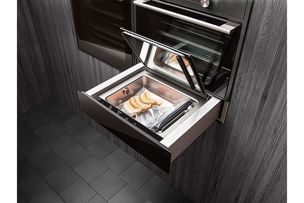 Вакууматор Asko ODV8127A шириной 59.7 см и высотой 14.1 см может встраиваться в колонну с другой техникой — например, устанавливаться под духовым шкафом или микроволновой печью. Фасад выполнен в цвете антрацит. Сенсорная кнопочная панель управления без выступающих элементов позволяет задать уровень вакуума и время герметизации, о выбранных параметрах работы сообщают специальные индикаторы. Данный вспомогательный девайс без ручки открывается нажатием на переднюю панель. Телескопические направляющие позволяют легко выдвинуть ящик. Трубка для внешнего вакуумирования предназначена для откачки воздуха из банок, контейнеров и пакетов. Её применяют, когда стандартный метод вакуумирования невозможен. С помощью трубки можно откачивать воздух напрямую изнутри ёмкости. Один конец подсоединяется к устройству, а другой — вставляется в контейнер или другую тару. Так можно для длительного хранения продуктов использовать нестандартную посуду. Для помещения пакета необходимо открыть крышку, оставить конец за уплотнительной лентой, закрыть крышку, задать уровень и время работы. Затем нажать на пуск. С помощью данного устройства можно подготовить продукты к длительному хранению в морозильной камере, лучше замариновать или законсервировать различные ингредиенты или же подготовить пищи к приготовлению в технике су-вид. 3 уровня вакуума предназначаются для разных видов продуктов: низкий для нежных продуктов — хлеба, ягод, фруктов, средний для жидкостей, рыбы, готовых блюд, высокий для твердых и сухих продуктов, мяса, жестких овощей. Можно выбрать также длительность запаивания в зависимости от толщины пакета. Кроме этого, данная модель предлагает три интервала работы: для тонких, средних и плотных пакетов. Для удобства использования вакууматора Аско ODV8127A представлен отдельный индикатор, который предназначается для вывода сообщения об ошибке. Ключевые преимущества нажимной механизм; три уровня вакуумирования; три уровня запайки. Ключевые особенности Вакууматор Asko ODV8127A выпускается цвета антрацит. Он считается одним из универсальных, поэтому отлично подойдёт для различных стилей интерьера: от ретро до современных.