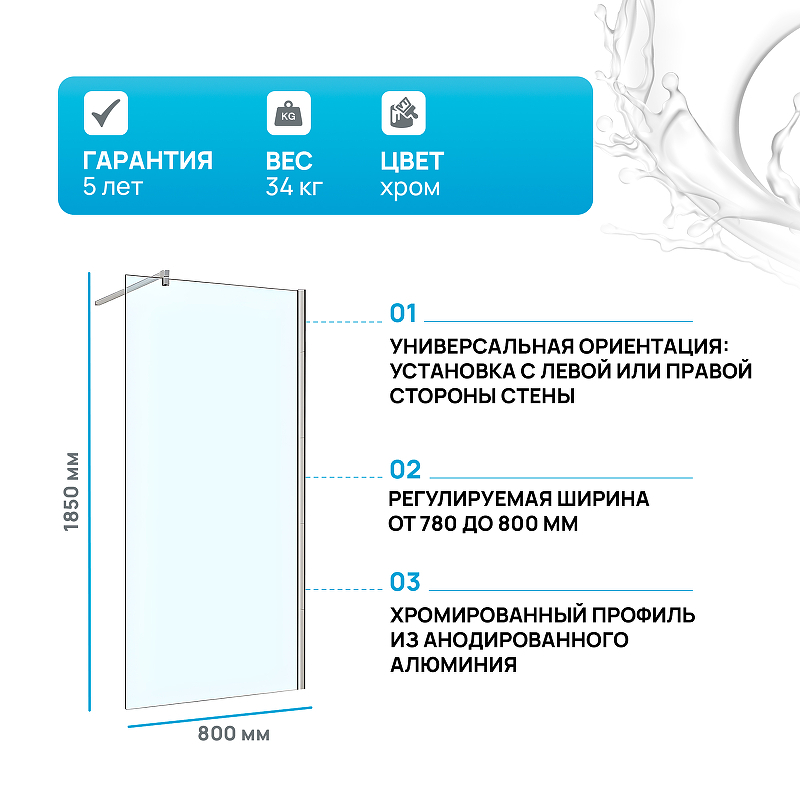 Стеклянная душевая перегородка WeltWasser WW400 G-1 80 со свободным входом с одной стороны.