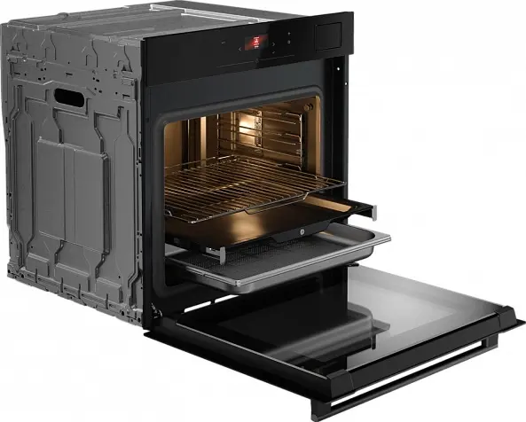 Духовой шкаф OCS26BGH сочетает современный дизайн и продуманные функции для удобного и эффективного приготовления. Мультифункциональная конструкция позволяет работать при температуре до 250°C, обеспечивая широкий диапазон режимов для выпечки, запекания и приготовления на пару. Объём оборудования рассчитан на комфортную готовку: комплект включает несколько противней, в том числе вместительный паровой противень, и одну решётку для гриля. Для удобства эксплуатации применены полностью выдвижные телескопические направляющие на первом уровне, а дверца оснащена плавным механизмом закрывания и съёмными стеклами для лёгкой чистки. Система активного охлаждения защищает элементы и снижает температуру поверхности дверцы, а охлаждаемая конструкция гарантирует безопасность в быту. Резервуар для воды ёмкостью 1,2 л обеспечивает паровые программы, упрощающие уход и улучшение текстуры блюд. Точность и надёжность подтверждены электропараметрами: питание 220–240 В, частота 50 Гц, предохранитель 16 А и низкое энергопотребление — класс A++ и расход при вентиляционном нагреве 0,52 кВт·ч. Корпус выполнен в элегантном чёрном стекле, рассчитан для встраивания в нишу от 560×590 мм и оснащён четырьмя регулируемыми ножками для точной установки.