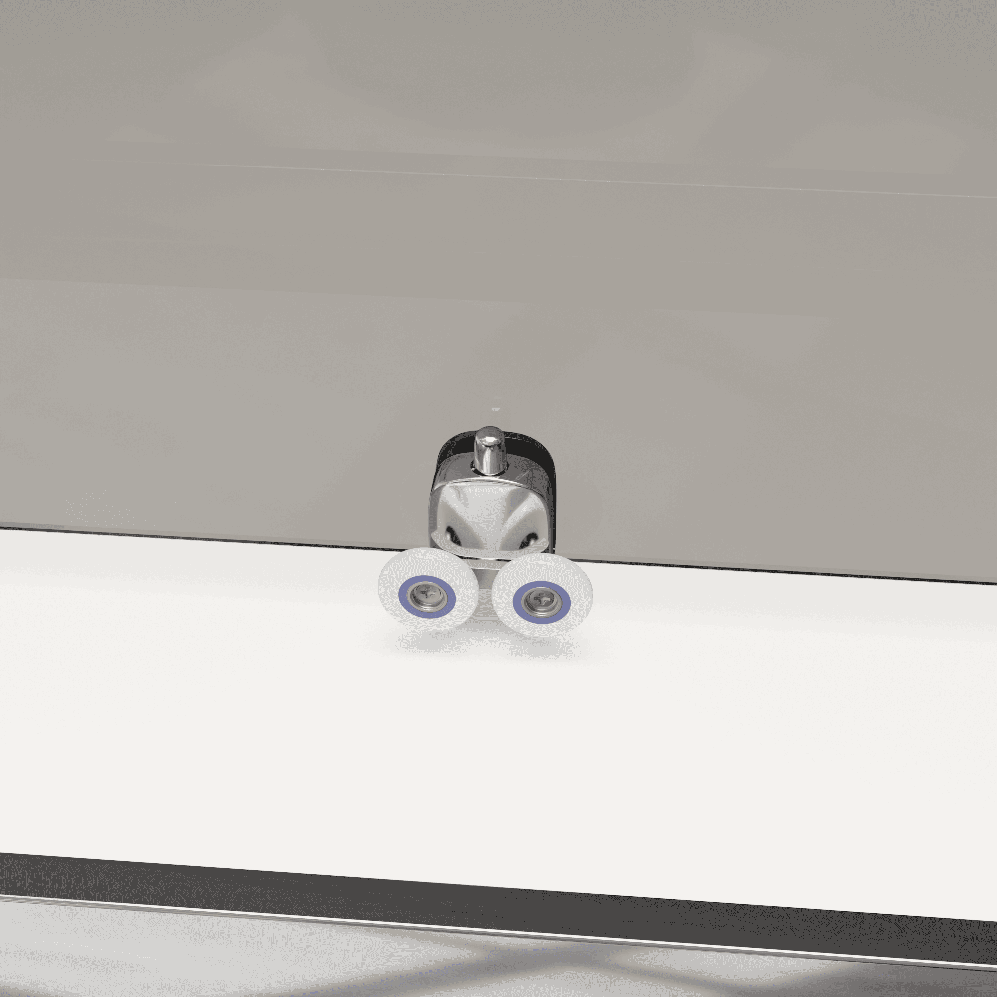 Душевая перегородка для ниши с раздвижной дверью, образует прямоугольную душевую зону. Ограждающая водяной поток, стеклянная дверь в душ, состоит из одного – стационарного полотна и второго полотна - «Дверь», установленного на ролики. При работе полотно плавно сдвигается вдоль душевой зоны, параллельно стационарного стеклянного полотна, образуя тем самым систему «Дверь - Купе».