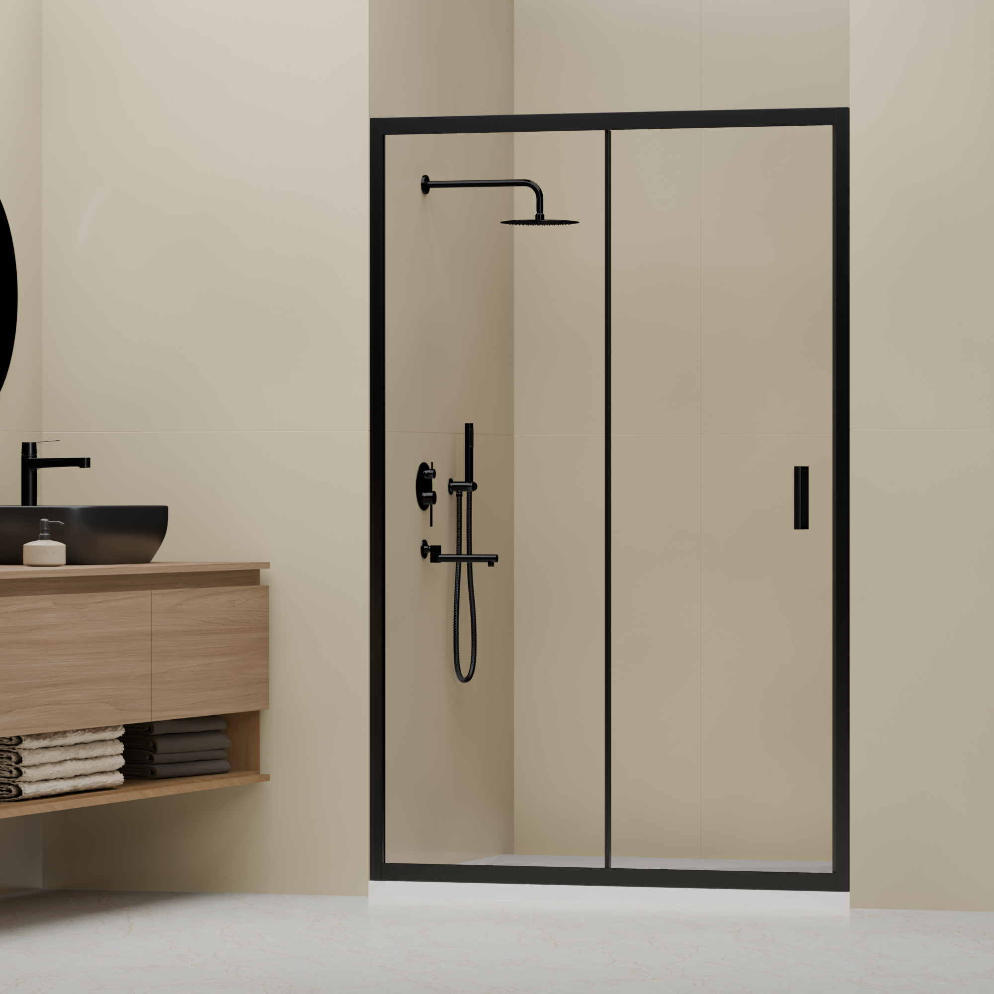 Конструкция дверей раздвижная. Она позволяет экономить место и удобно пользоваться душевой кабиной.