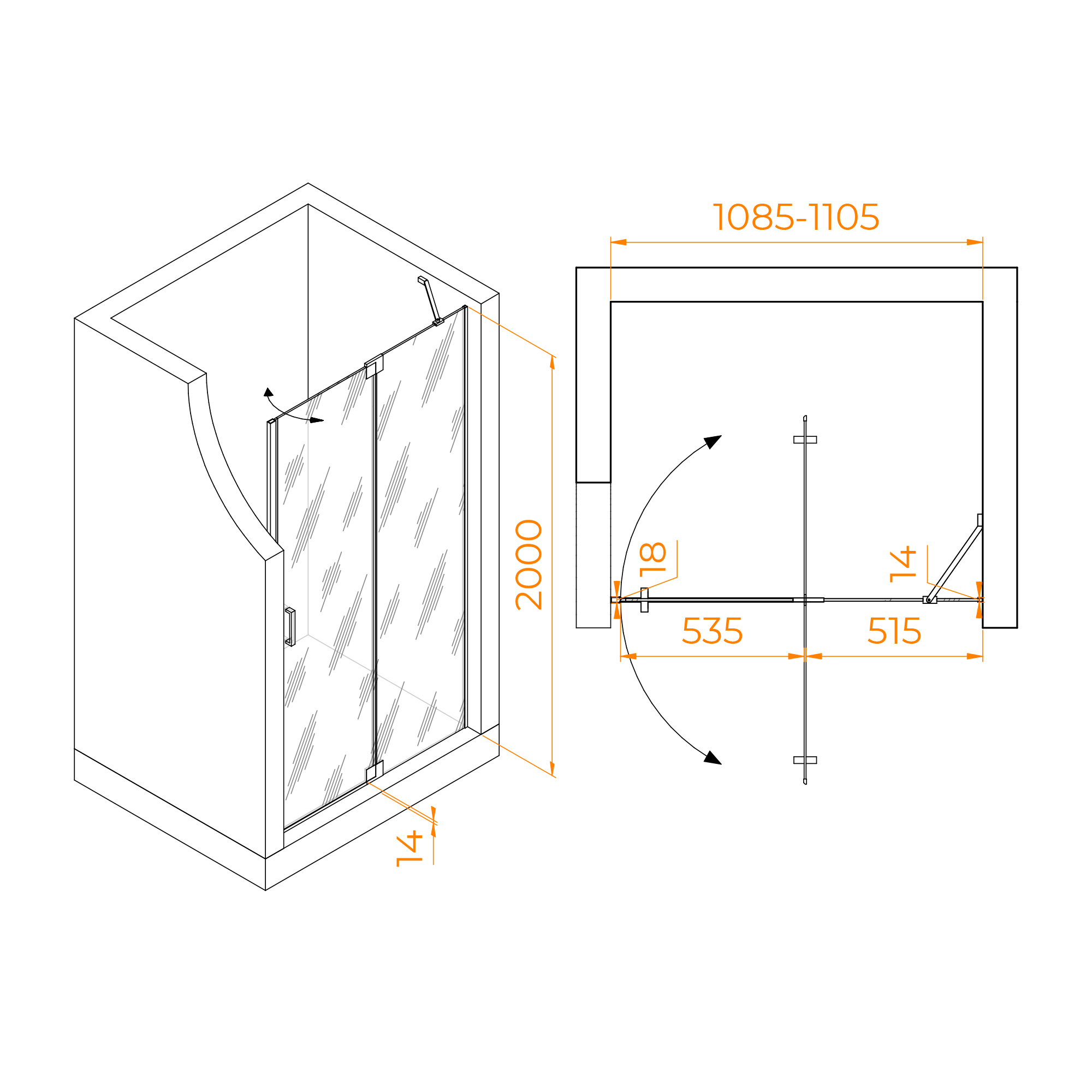 Душевая распашная маятниковая дверь RGW HO-014 – реверсивная установка, монтаж на любую сторону открытия двери. Возможна комплектация боковой панелью для образования угла.