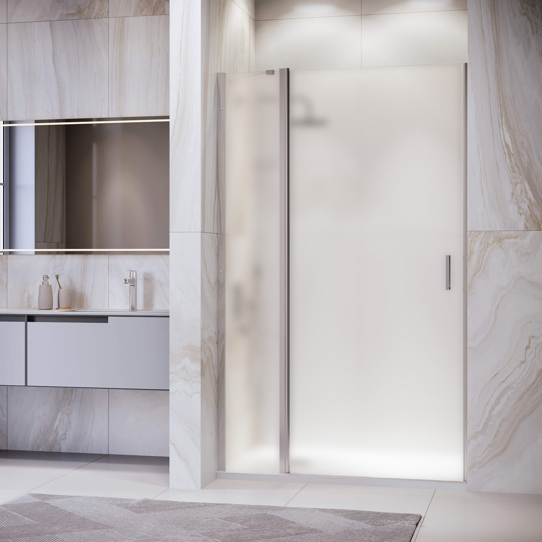 Элегантные стеклянные двери с пристенными профилями придают ванной комнате изысканность и строгость. Модели оснащены маятниковой петлёй, с защитой от провисания и подъёмом двери при открытии. Такой системой будет особенно удобно пользоваться если дверь установлена на плитку с встроенным трапом. Изделия оснащены Распашные двери открываются как наружу, так и внутрь, что обеспечит максимальный комфорт в процессе использования душевого пространства.