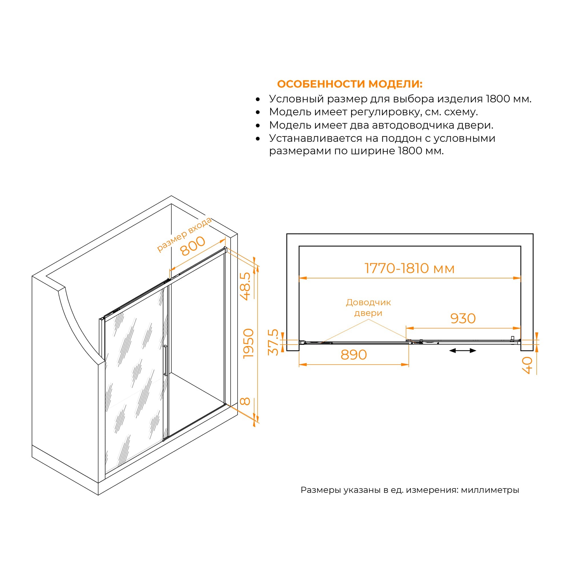 Функция регулируемого профиля обеспечивает легкую установку и настройку. Это обеспечивает идеальную посадку для вашей конкретной душевой зоны, устраняя любые зазоры или утечки. Роликовый подшипниковый механизм обеспечивает долгую и плавную работу двери.
