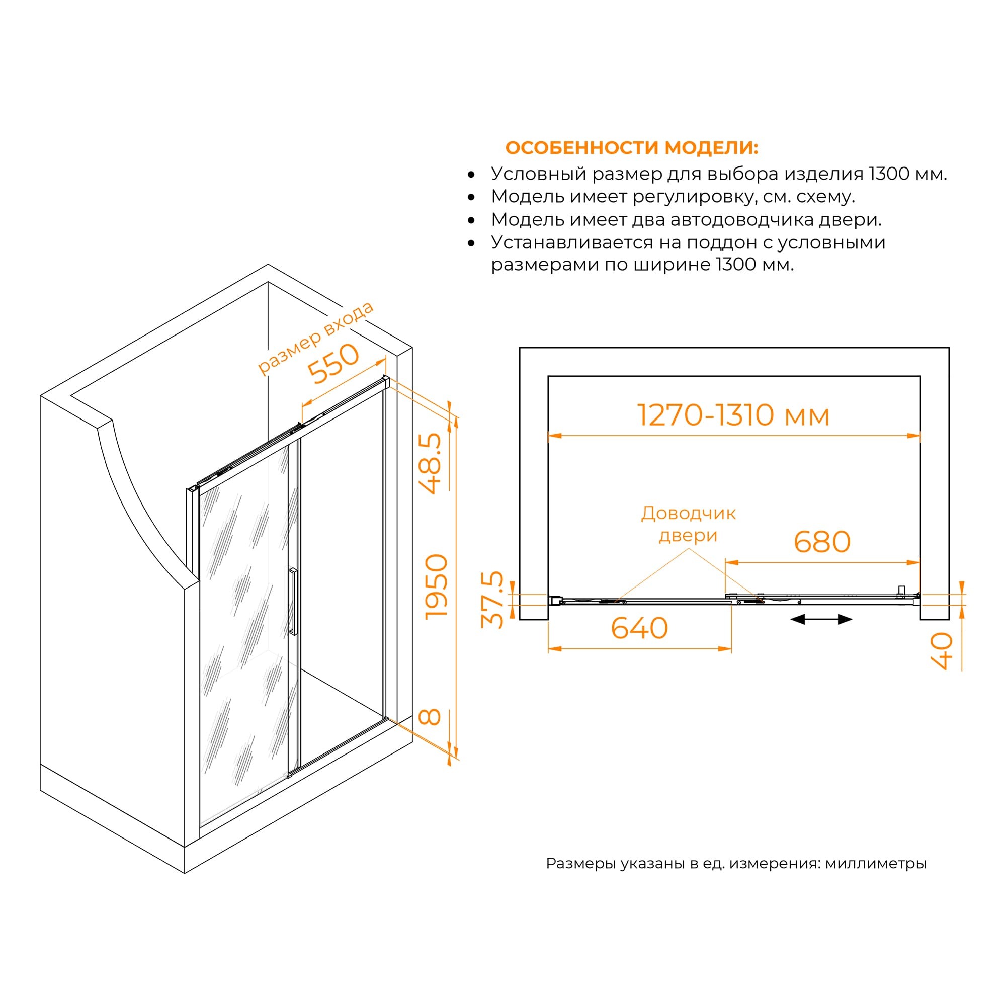 Высота общая двери составляет 1950 мм, что позволяет использовать ее даже в помещениях с высокими потолками. Двойные регулируемые ролики обеспечивают плавное и бесшумное скольжение двери при открытии и закрытии. Конструкция дверей раздвижная, что позволяет сэкономить место в ванной комнате.