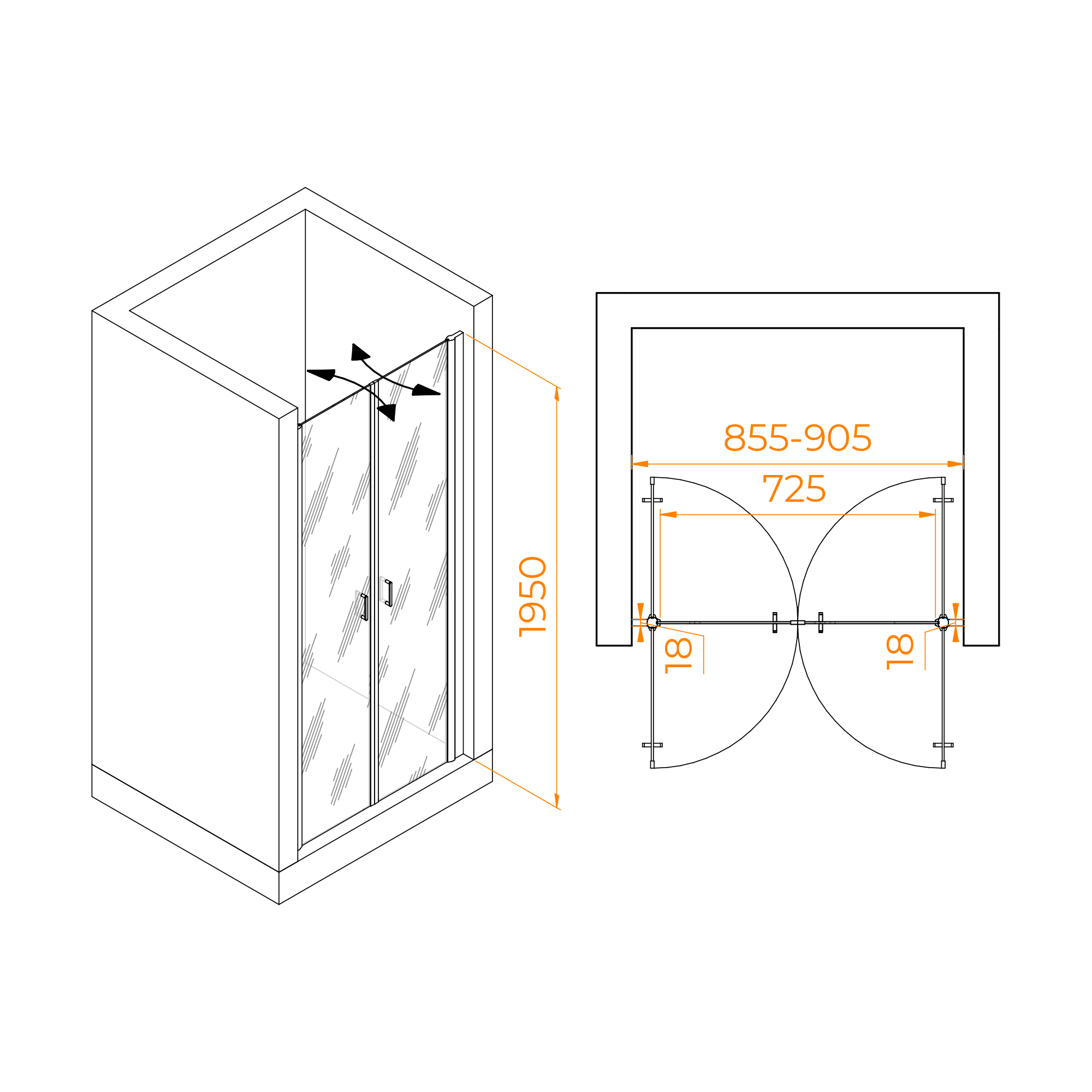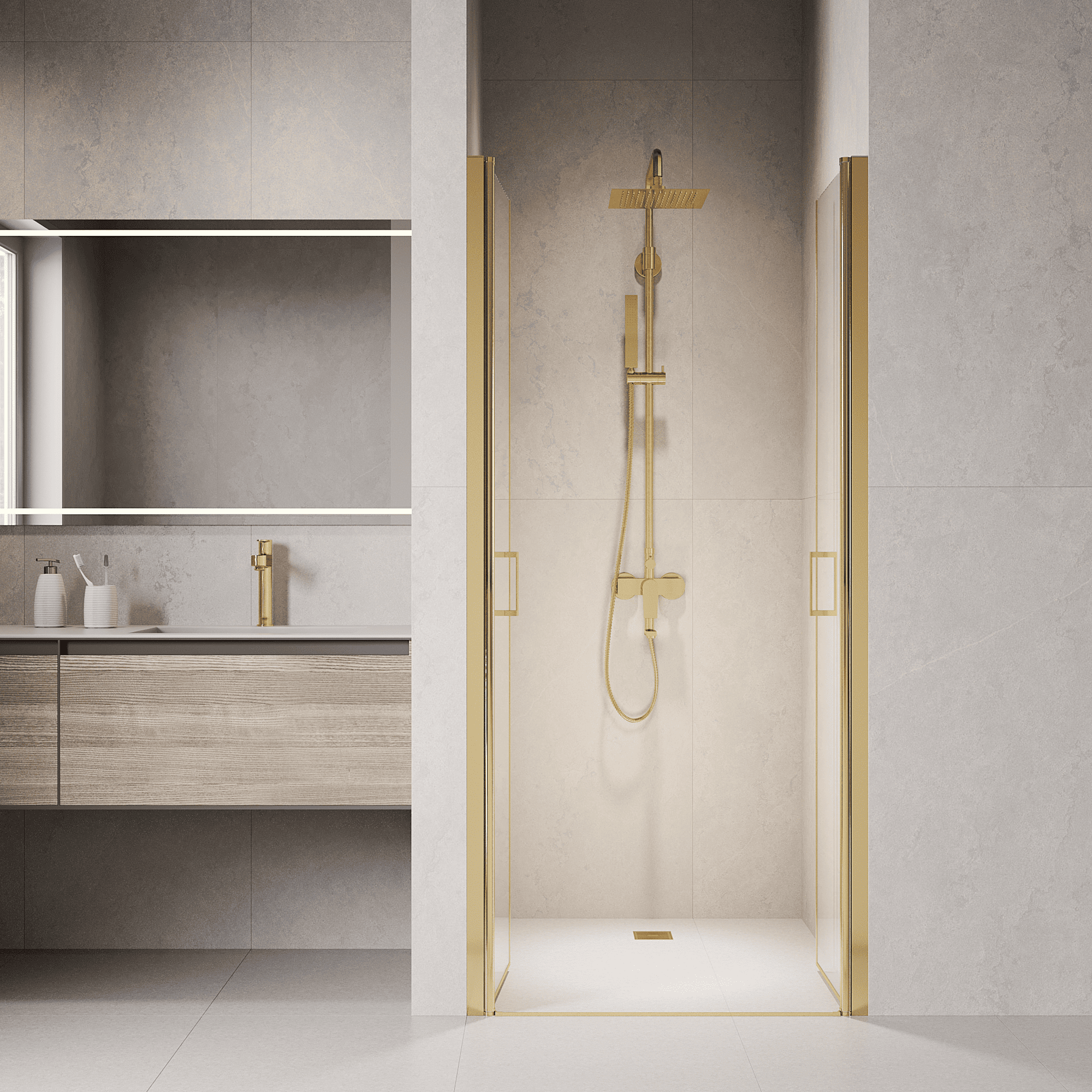 Двух створчатая маятниковая душевая дверь PA-104 с механизмом "Gravity Loop" представлена в популярных цветовых решениях: хром, черный и золото brush.