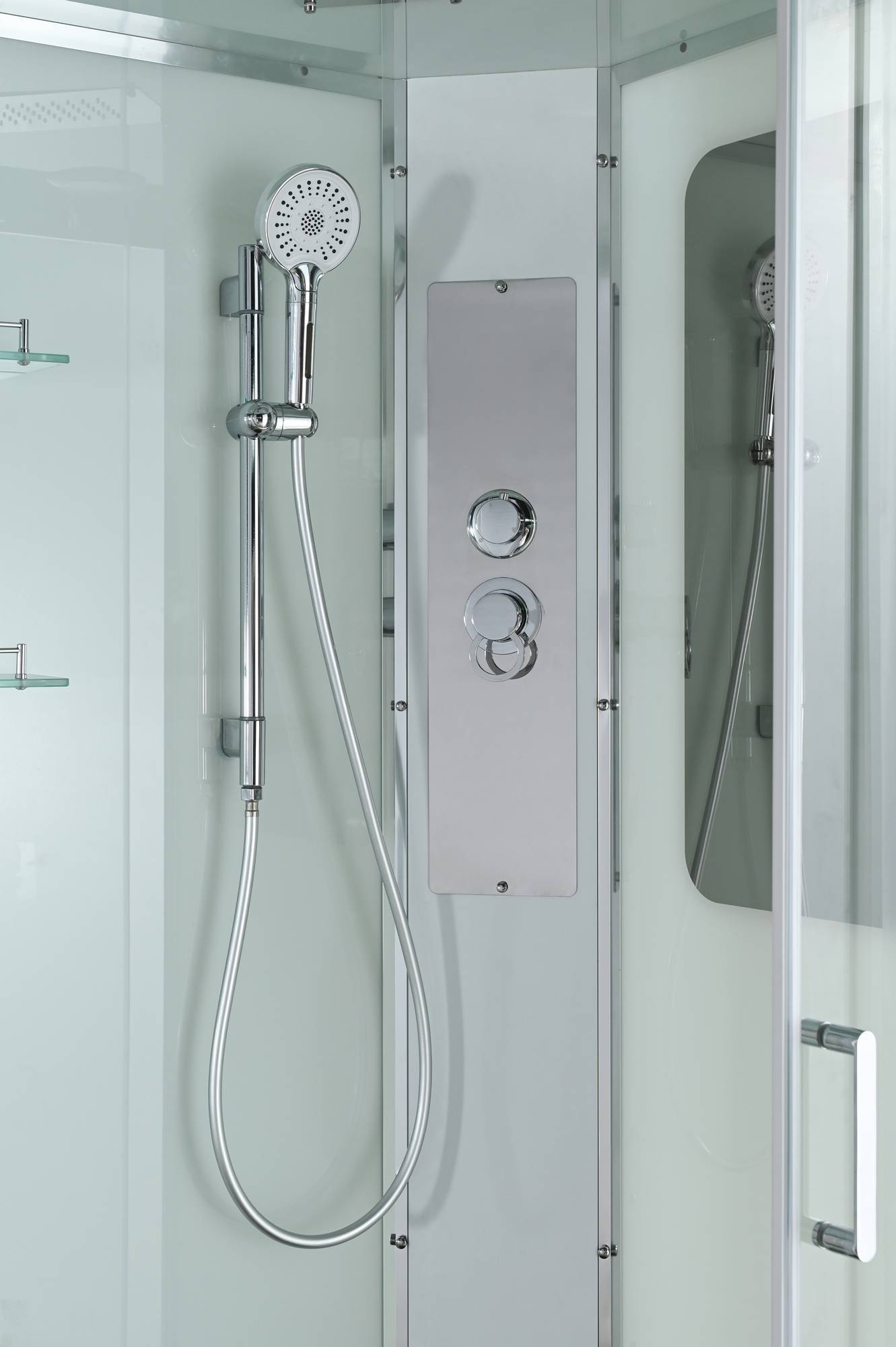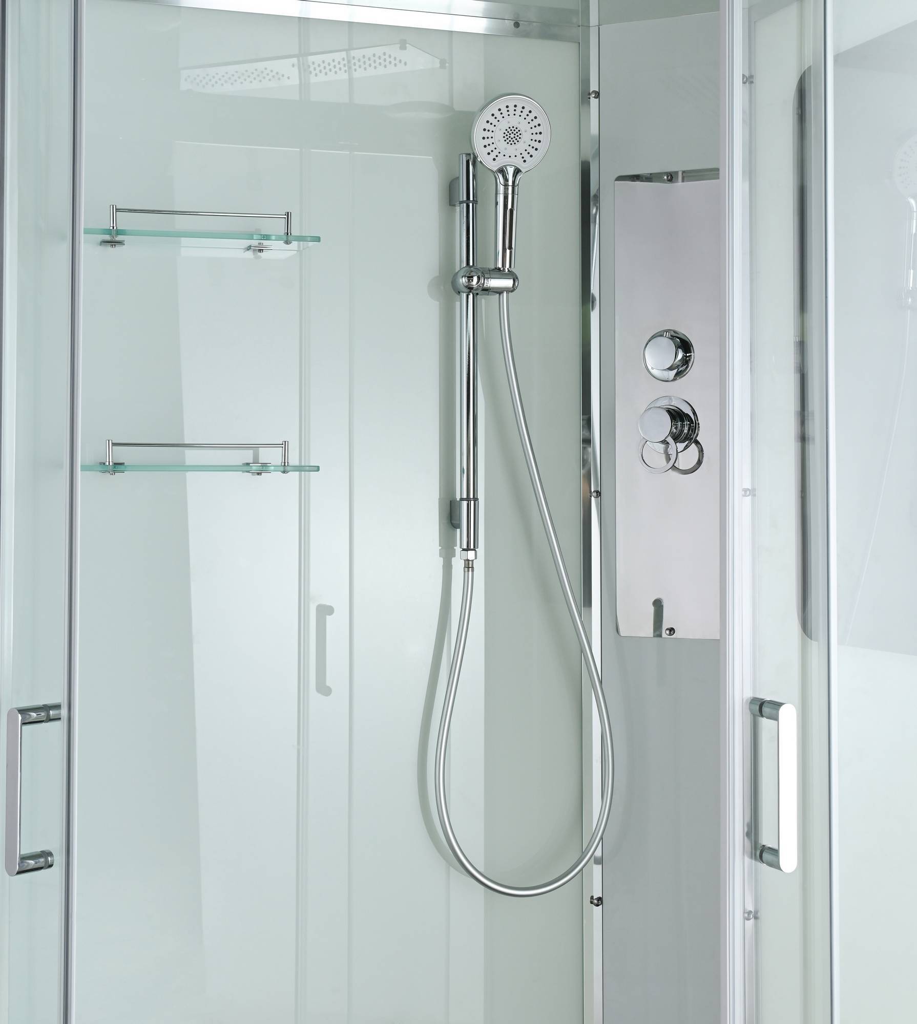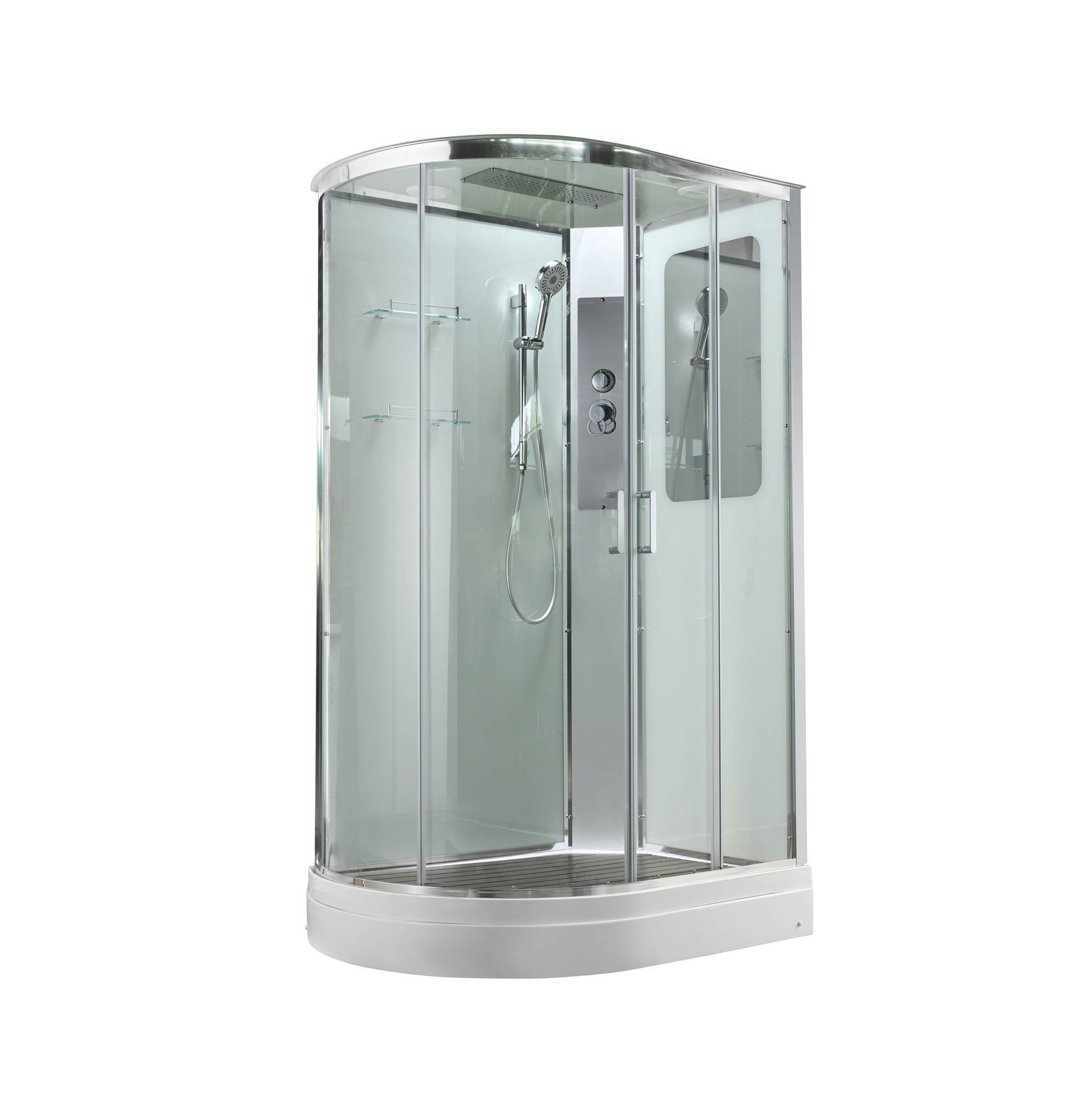 полимерная вставка в поддон(имитация дерева)/сифон/ Переключатель режимов /2-е Полочки /резьбовой смеситель / Тропический (верхний) душ/ручки дверей из нержавейки /арома-лейка с витамином С/ Душевая штанга /встроенное зеркало/