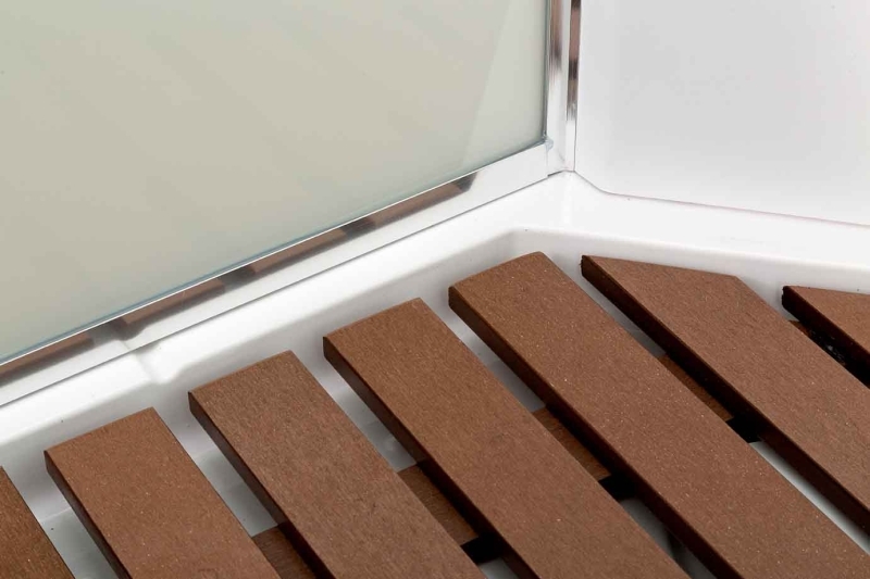 Деревянная вставка в поддон / Душевой гарнитур / Зеркало / Переключатель режимов / Полочки / Смеситель / Тропический (верхний) душ