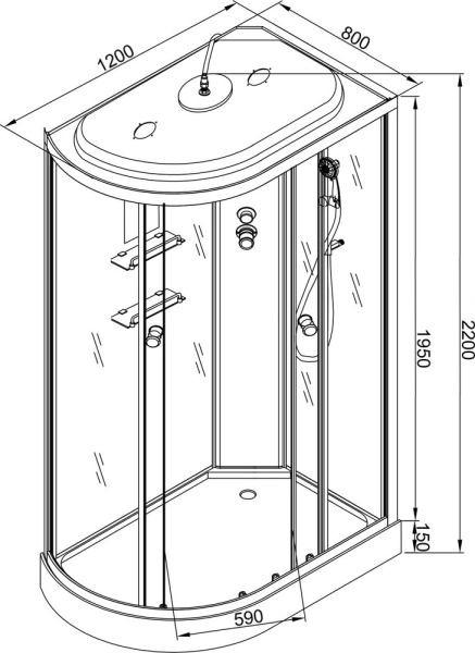 Вентиляция /вставка в поддон / Гидромассажные форсунки / Зеркало / Переключатель режимов / Полочки / Радио / Сенсорный пульт управления / Смеситель / Тропический (верхний) душ