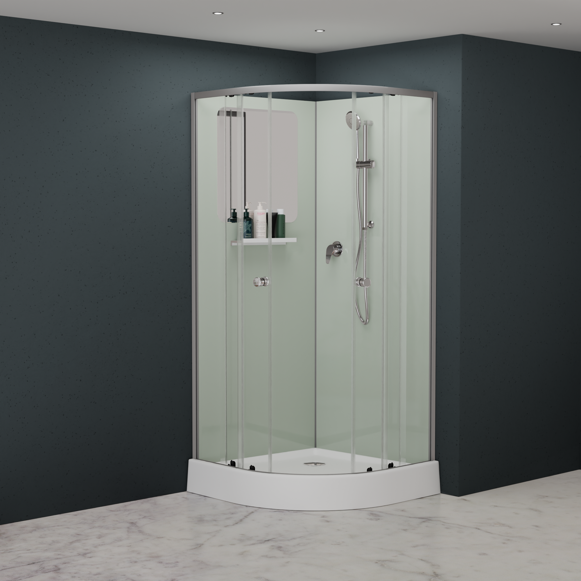 Душевая кабина состоит из трех упаковок – душевого ограждения, состоящего из 2-х упаковок, и душевого поддона, душевая лейка со штангой уложены в упаковку с душевым поддоном и при сборке образуют душевой бокс минимального наполнения. Однако функциональность модели достигается за счет классической формулы душевой зоны: встроенный однорычажный смеситель, душевая лейка на штанге, полочка для гигиенических принадлежностей и интегрированное зеркало.