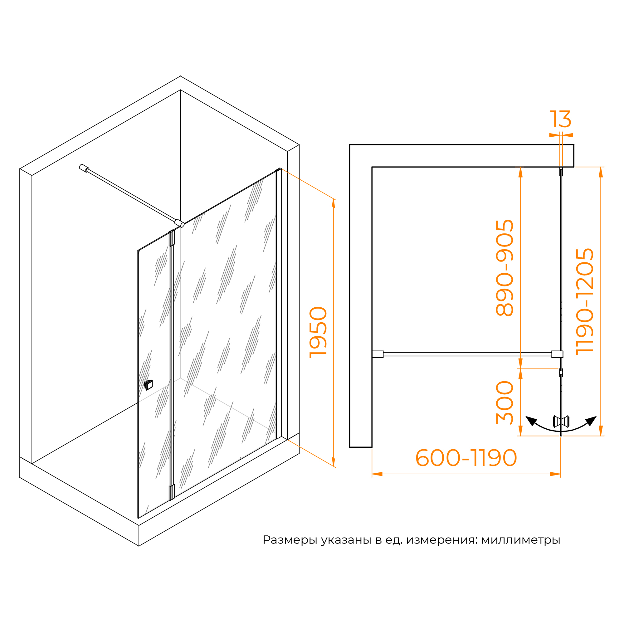 Душевая перегородка состоит из стационарного полотна и полотна с поворотной маятниковой частью - 300 мм. Стационарное стекольное полотно крепится к стене алюминиевым профилем с декоративной заглушкой. Подвижное полотно закреплено стальной маятниковой петлей с ходом 180 градусов.