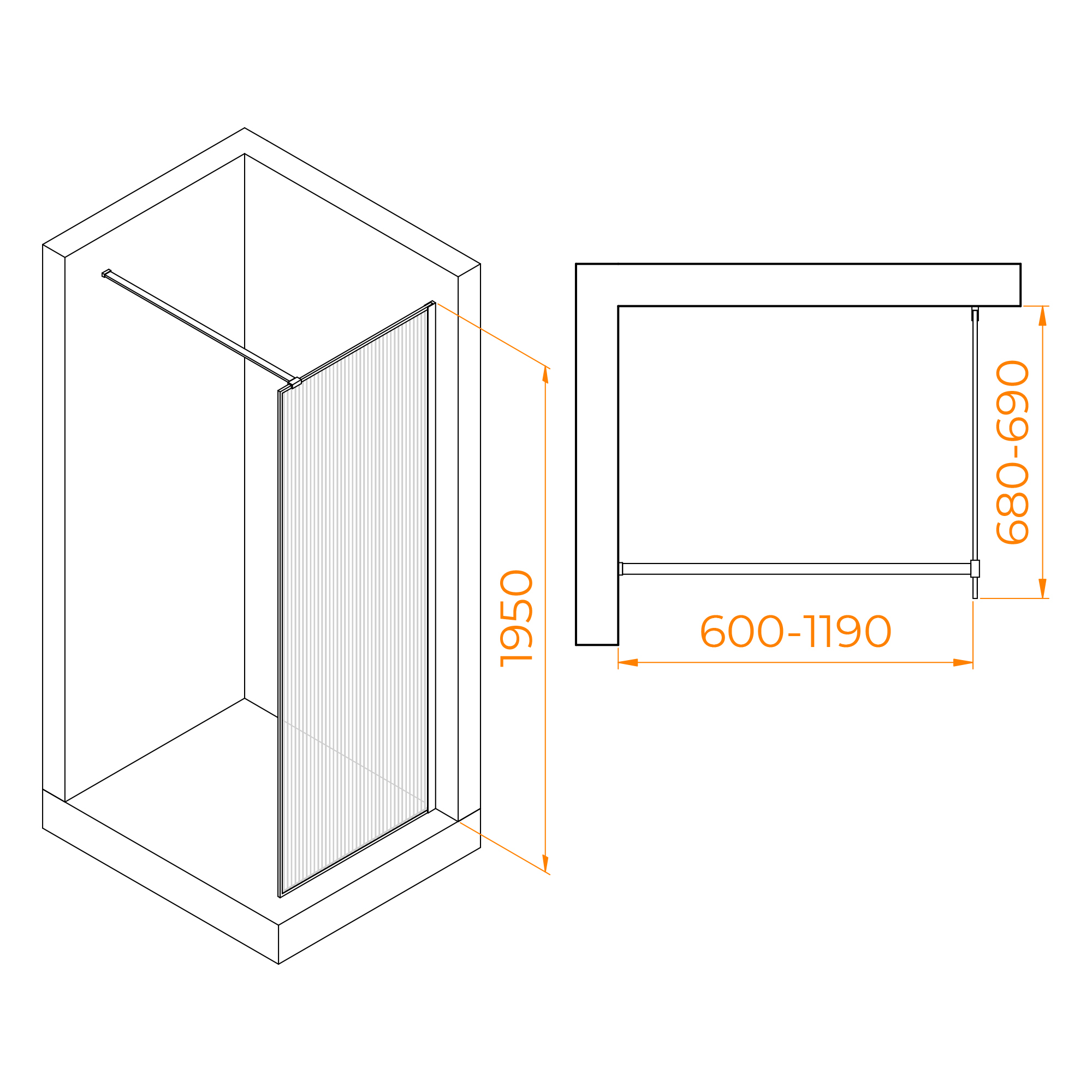 Эта стеклянная душевая перегородка высотой 1950 мм создает уникальное душевое пространство, визуально увеличивая площадь ванной комнаты. Конструкция крепится к стене с помощью пристенного соединительного профиля и штанги держателя.