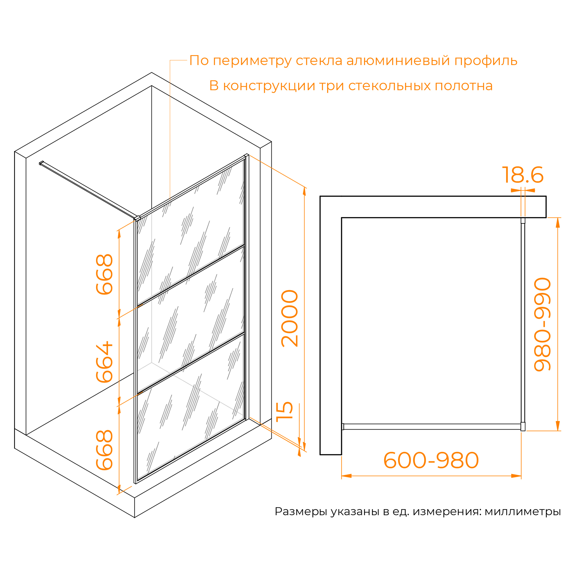 Душевая перегородка состоит из 3-х стекольных полотен (8мм), которые обрамлены изящным анодированным алюминиевым профилем!