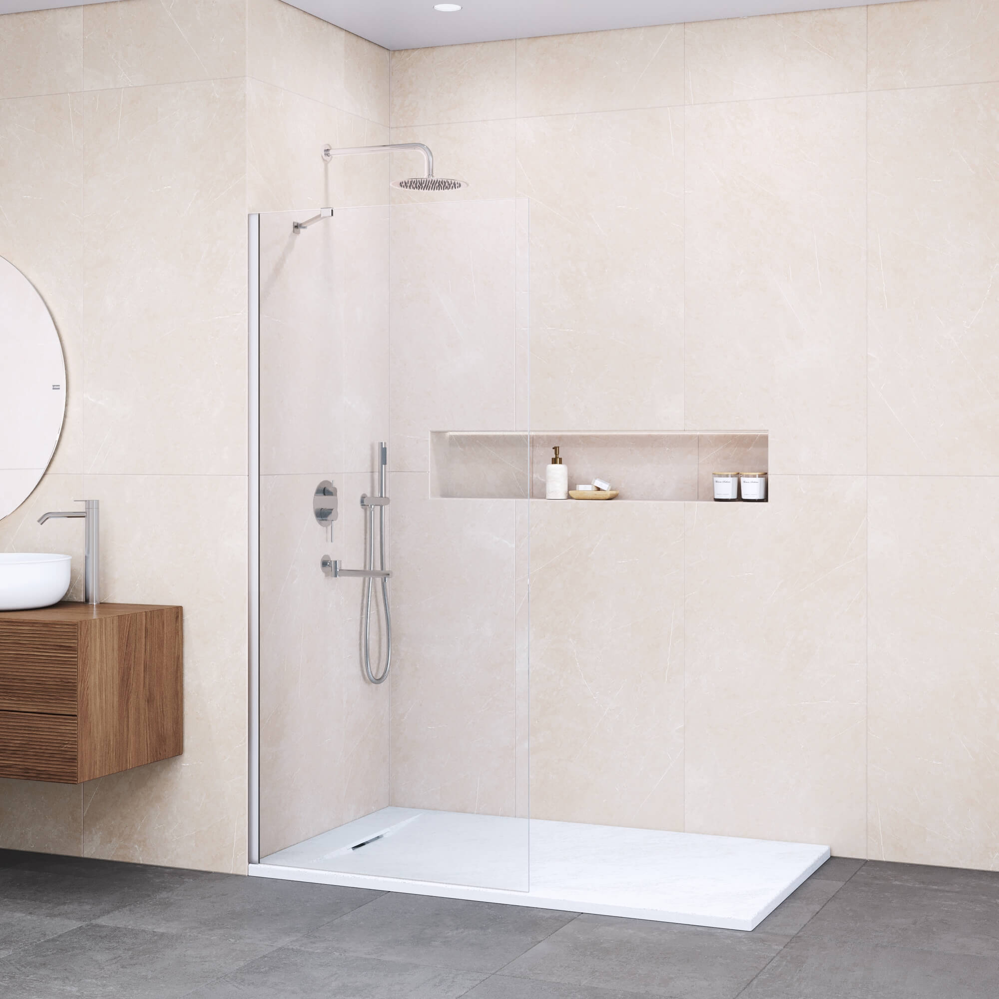 Главной особенностью данной перегородки является толщина стекла в 8 мм. Благодаря этому, конструкция является надежной и устойчивой к механическим воздействиям. Также стекло имеет прозрачный цвет, благодаря чему сохраняется прозрачность в ванной комнате.