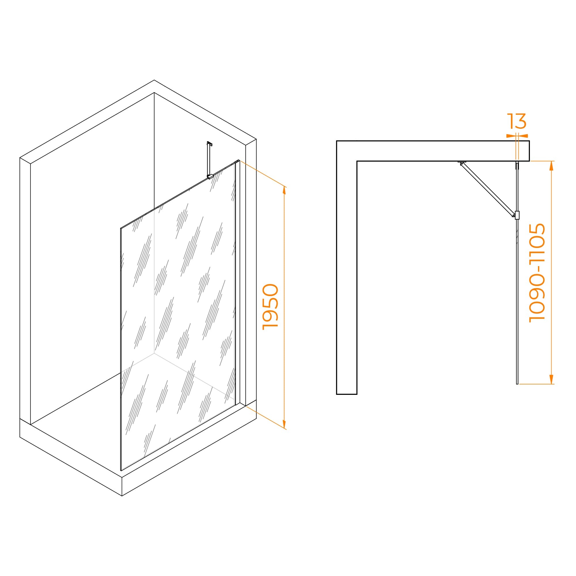 Толщина стекла данной перегородки составляет 8 мм, что делает ее очень прочной и надежной в использовании. Прозрачное стекло позволяет сохранить свет и пространство в ванной комнате, а черный цвет профиля придает ей элегантный и современный вид.