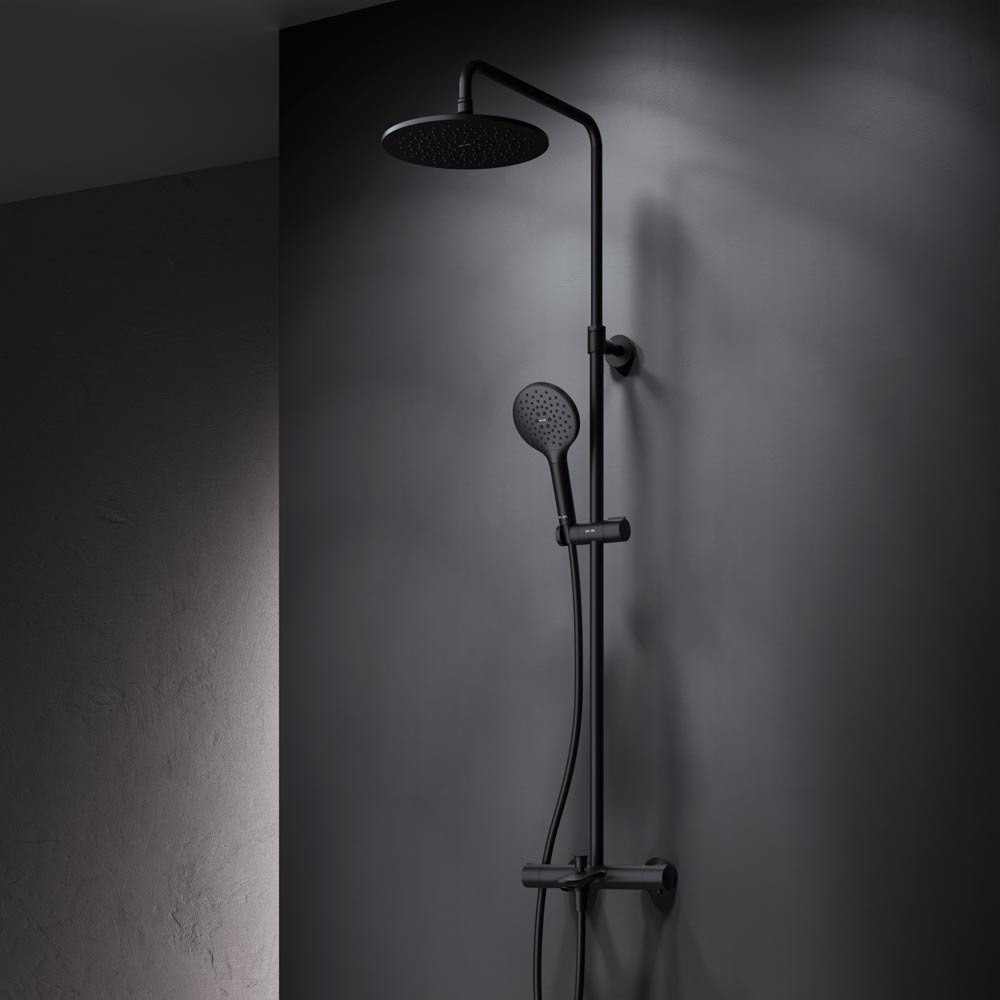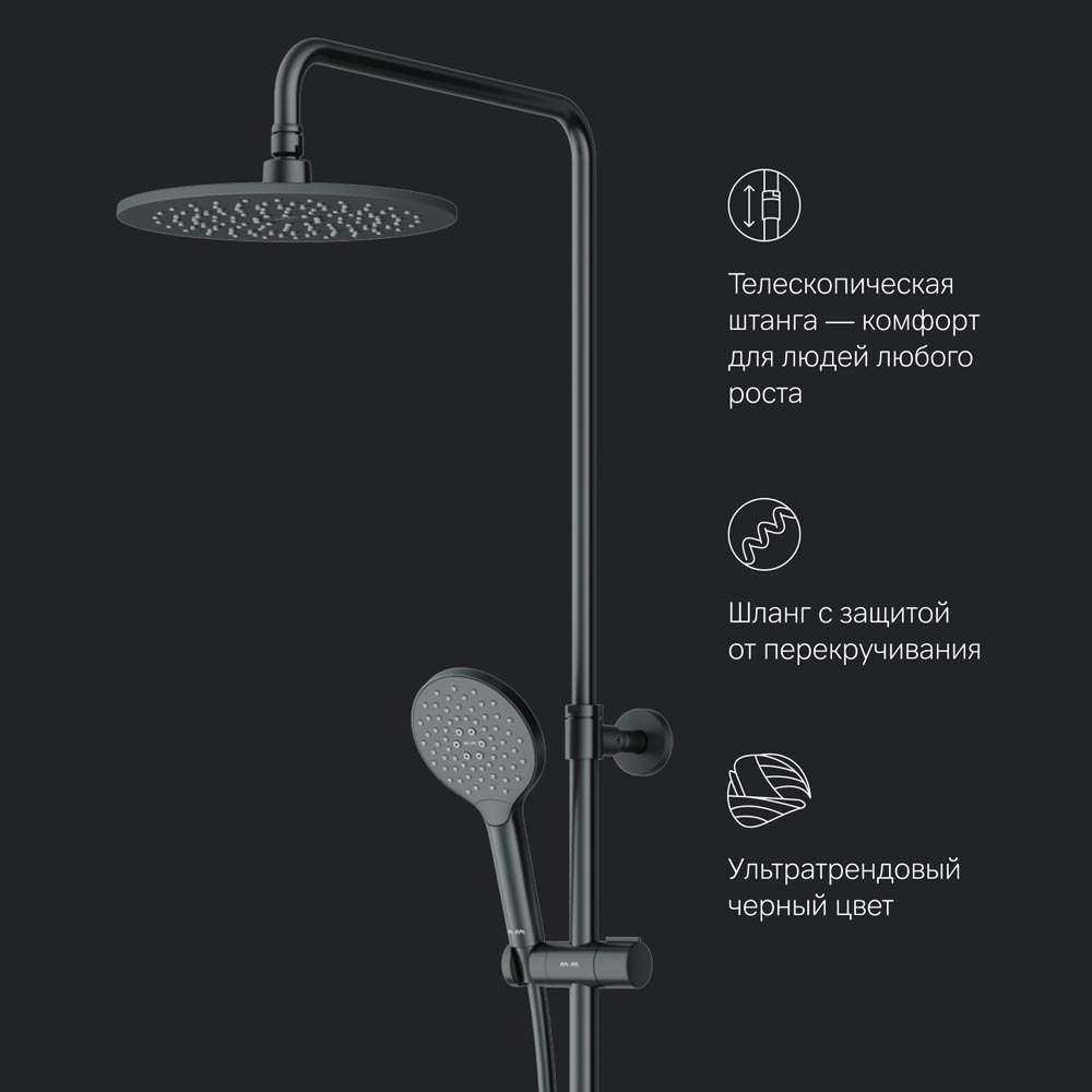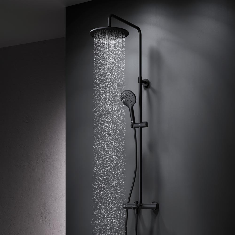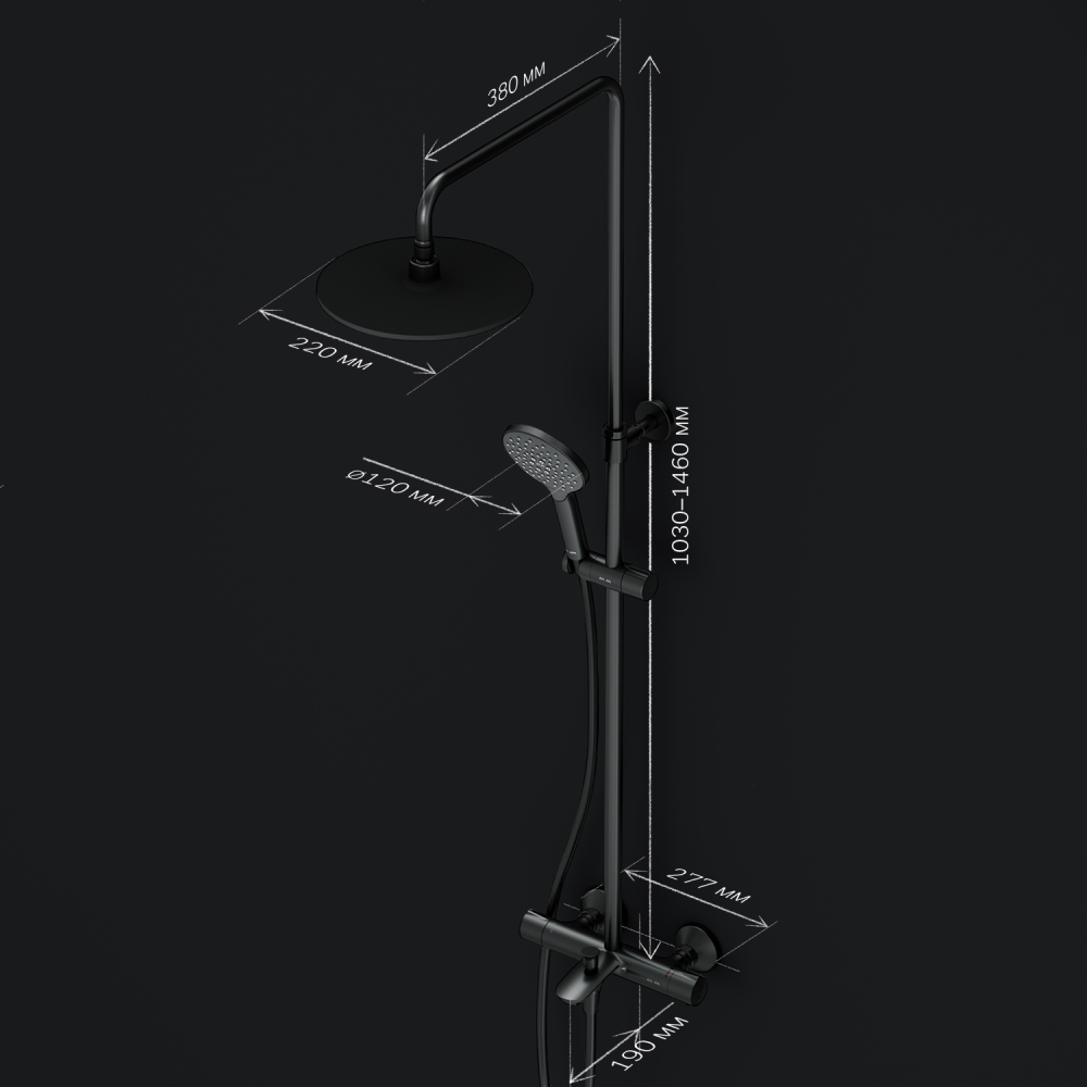 Тотальный дизайн в действии: все детали душевой системы – от пропорций ручного и верхнего душей до рисунка расположения форсунок на лейках – подчинены единой концепции в ультрамодном стиле Dynamic Organic. Продуманные детали для удобства использования: штанга регулируется по высоте в диапазоне от 1030 до 1460 мм обеспечивая комфорт для людей любого роста шаровый шарнир в держателе верхнего душа позволяет регулировать угол его наклона душевой шланг 1750 мм верхний душ диаметром 220 мм ручной душ диаметром 120 мм. Смеситель для ванны и душа с термостатом: термостатический картридж с высокочувствительным термоэлементом стопором безопасности на 38 градусов быстрой реакцией на изменения температуры или давления надежно защищает от ожога даже при внезапном отключении холодной воды. ""