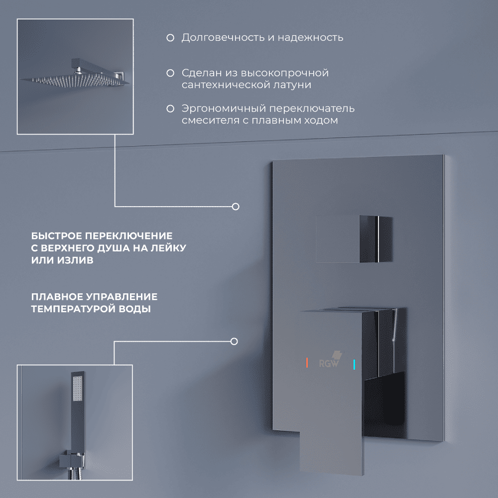 Душевые системы RGW с верхним душем гармонично вписываются в интерьер любой ванной комнаты за счет современного дизайна и продуманной эргономики.