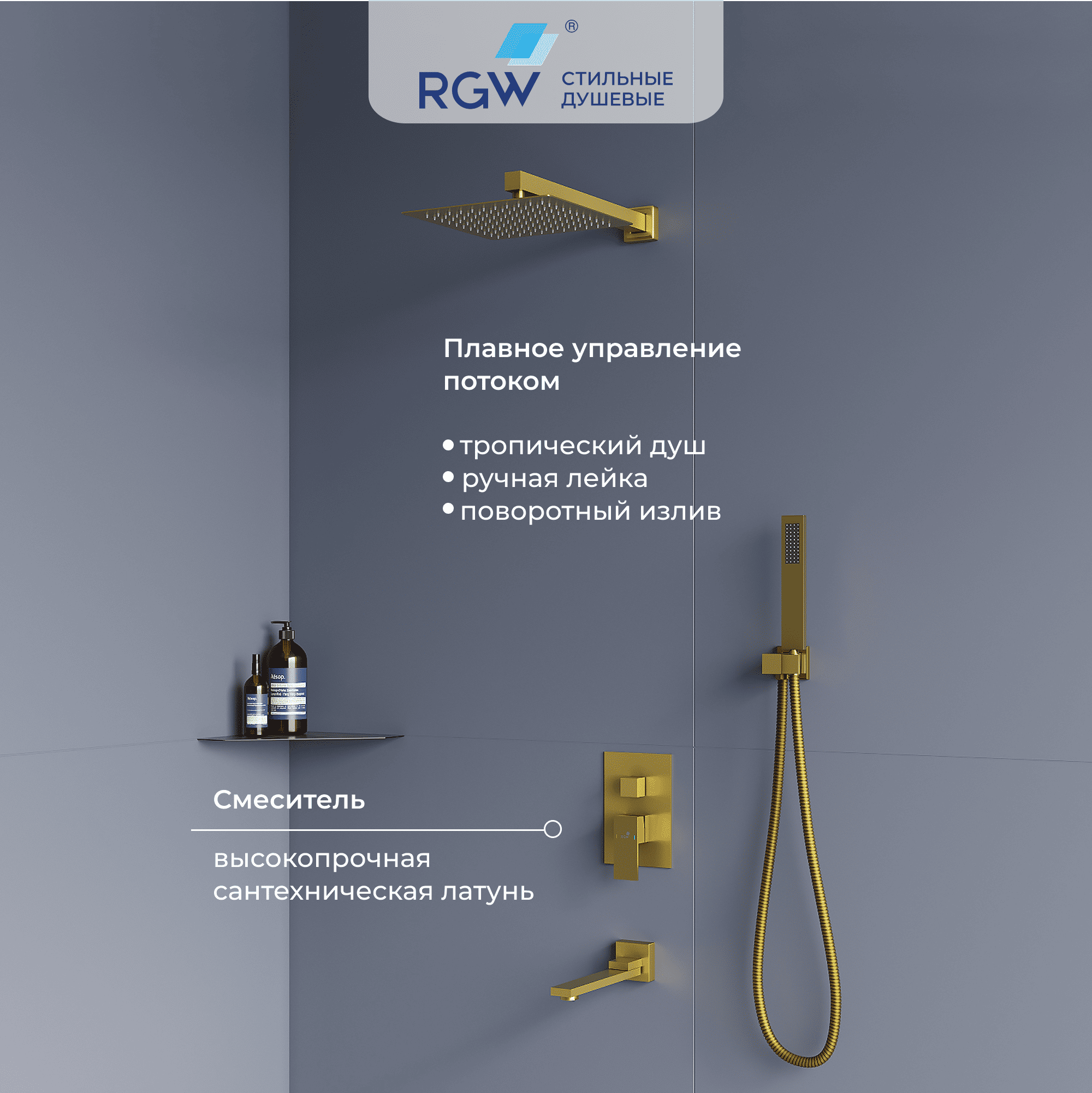 Душевые системы RGW с верхним душем гармонично вписываются в интерьер любой ванной комнаты за счет современного дизайна и продуманной эргономики.