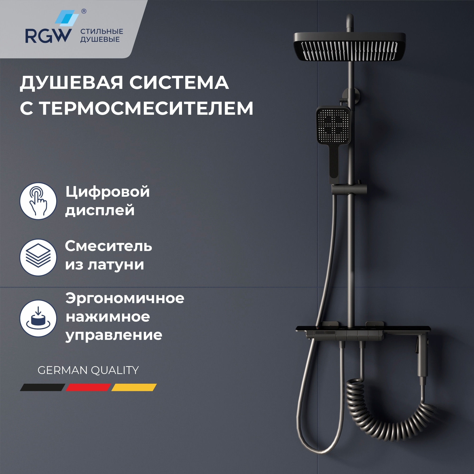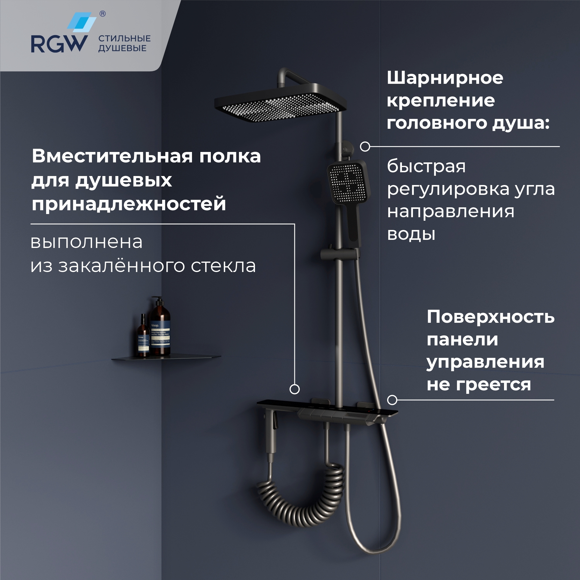 Душевая стойка, клавишное управлением режимами, с полкой, с термостатом - RGW SP-35 серая-оружейная сталь