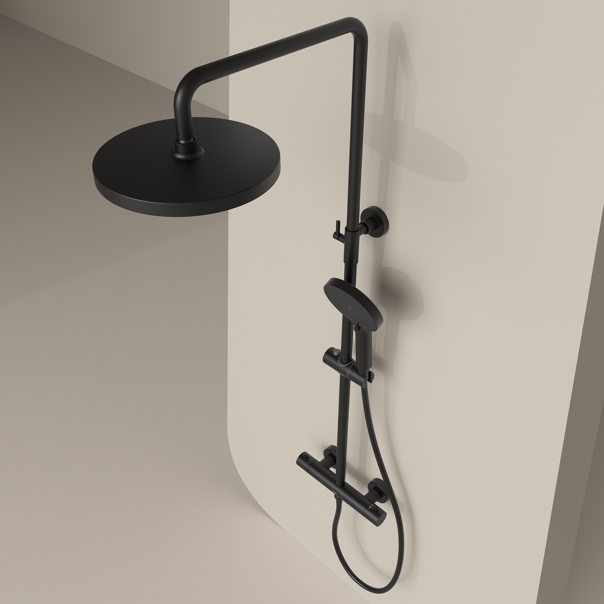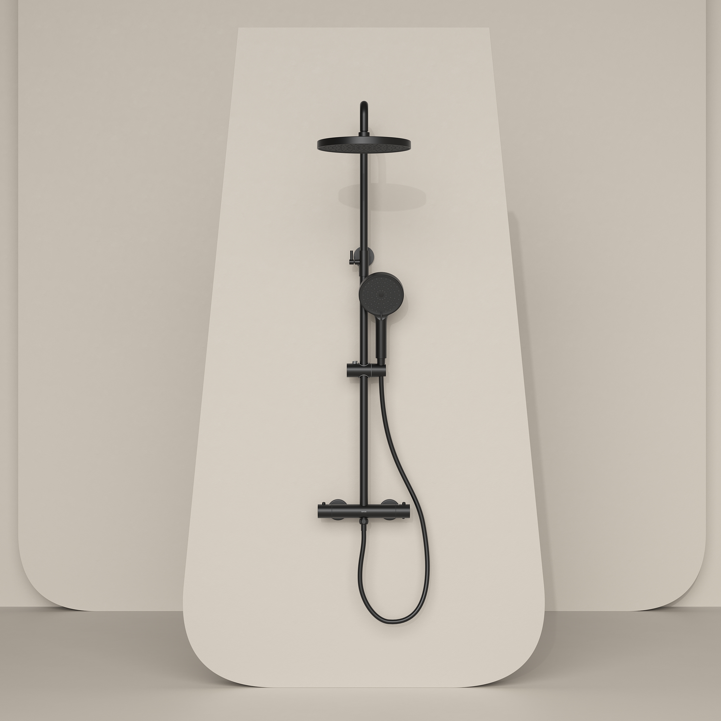В комплекте: смеситель с термостатом, душевой шланг, душевая лейка, держатель для душа, верхний душ, штанга, эксцентрики