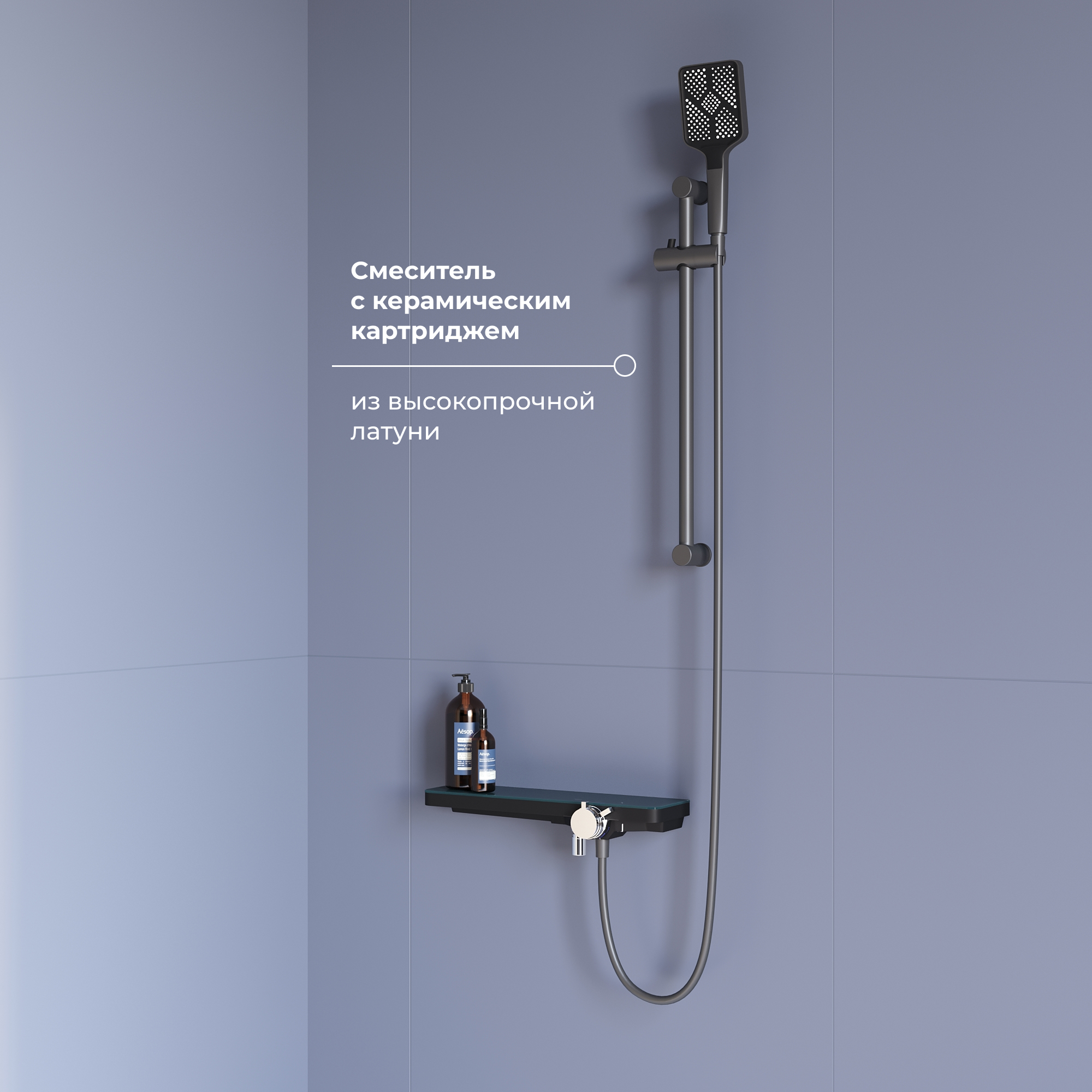 Корпус смесителя выполнен в виде вместительной и удобной полки для душевых принадлежностей, что делает его не только стильным элементом интерьера, но и практичным решением для организации пространства.