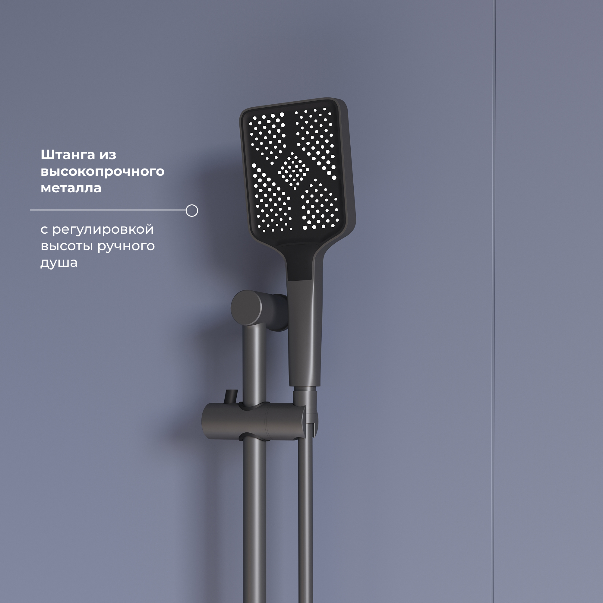 Металлическая штанга с регулировкой высоты держателя ручного душа обеспечивает идеальное положение для пользователя, позволяя подстроить его под любые индивидуальные предпочтения. Ручной душ выполнен из устойчивого к износу ABS-пластика и имеет гибкий шланг длиной 1.5 м с тремя режимами струи, что гарантирует разнообразие в использовании и удобство при душевых процедурах.