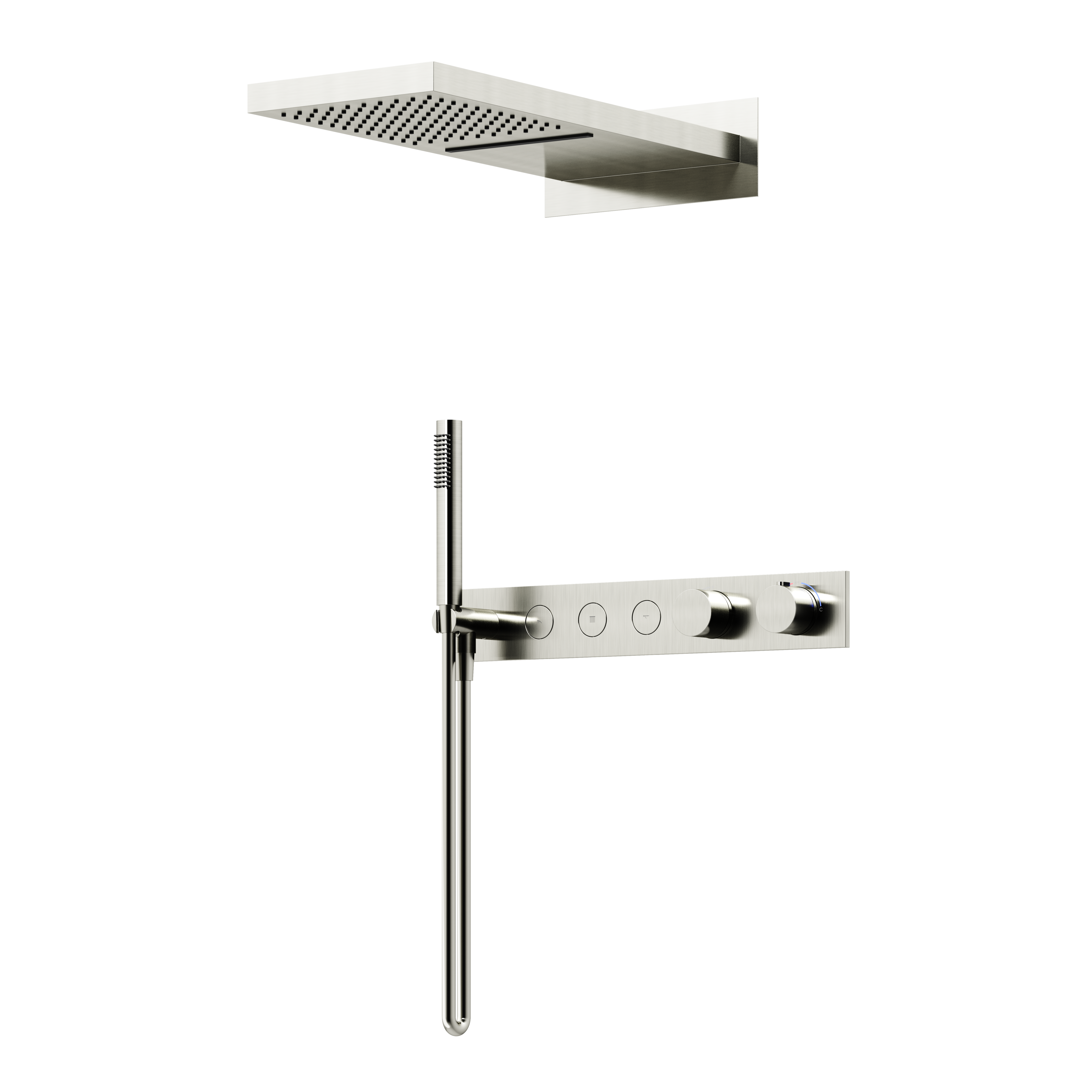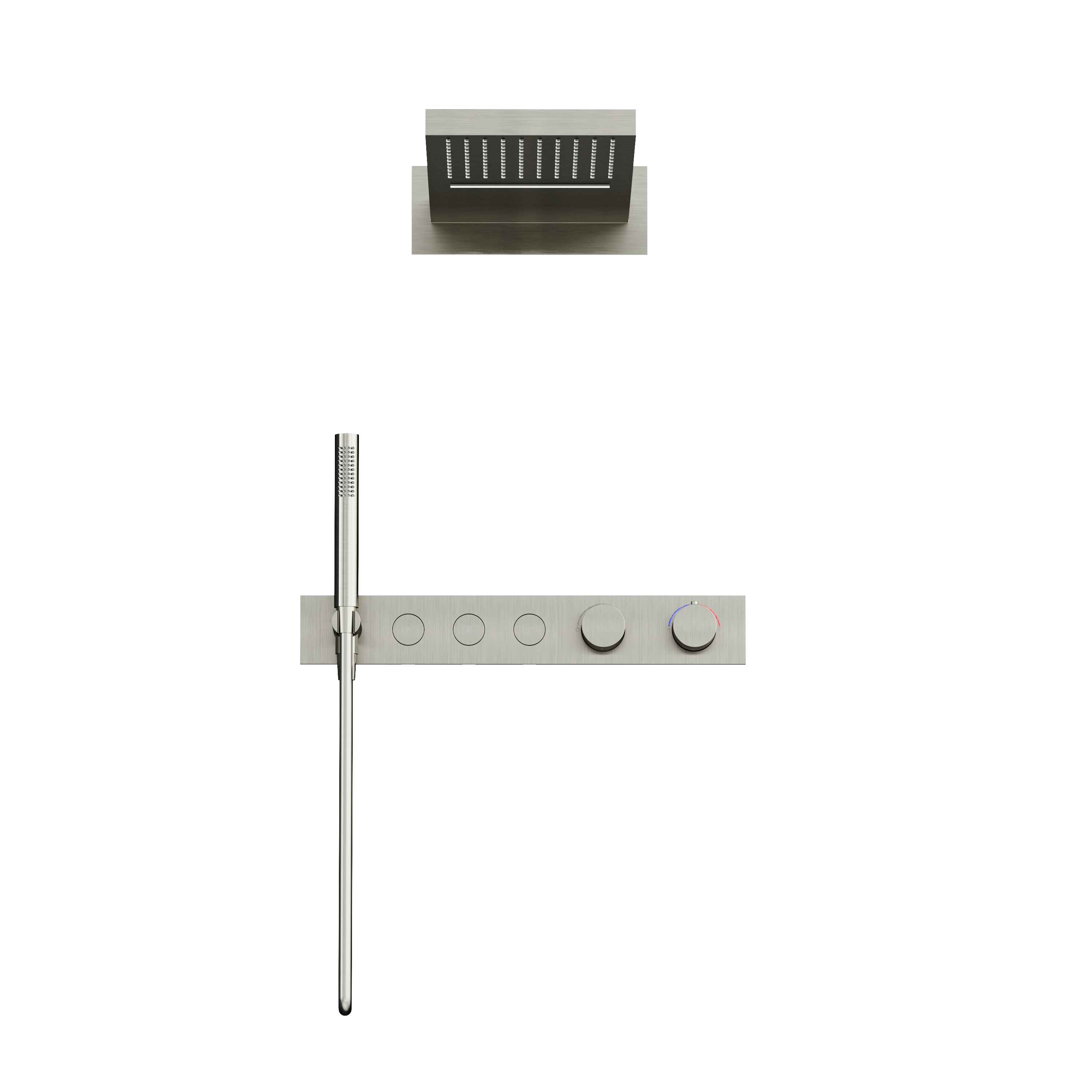 - Встроенный девиатор автоматически переключает поток с верхнего душа на ручной при выключении воды. Кнопочное управление режимами верхнего душа и источниками воды. Ручной душ из латуни со шлангом из ПВХ с системой защиты от перекручивания, длина 1,5 м. Верхний душ из нержавеюшей стали