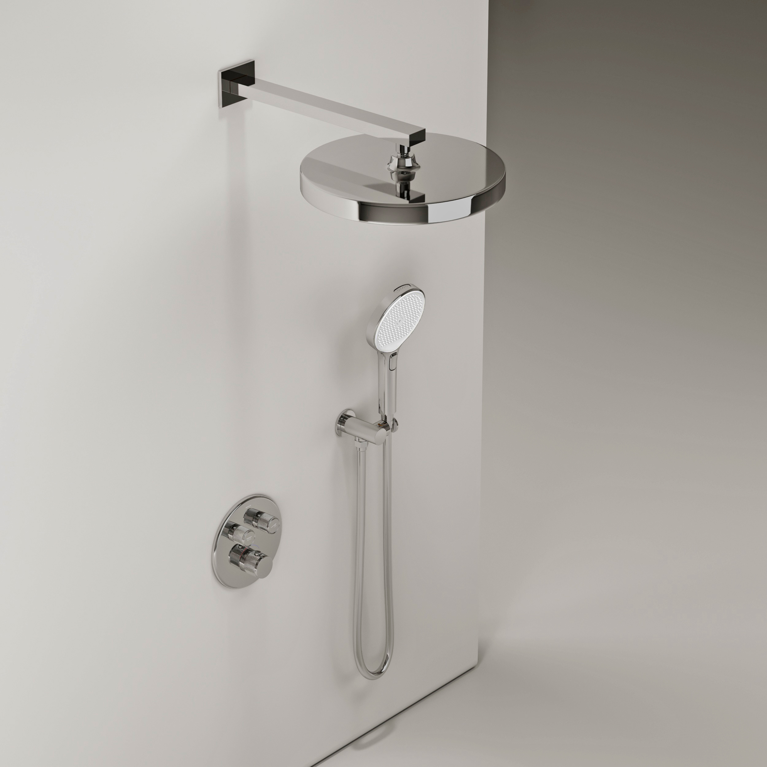 - Встраиваемый термостатический смеситель с внутренним блоком в комплекте. Удобное кнопочное управление между источниками воды.