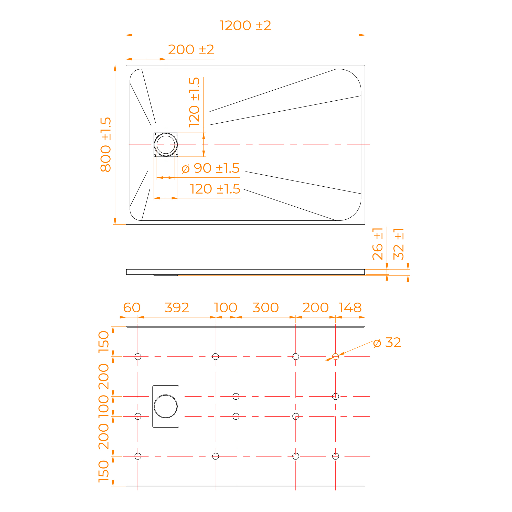 Длина и ширина: от 800х1000 мм до 900х1200 мм. Поддон с широким размерным рядом даёт возможность подобрать оптимальный вариант для вашей ванной комнаты.