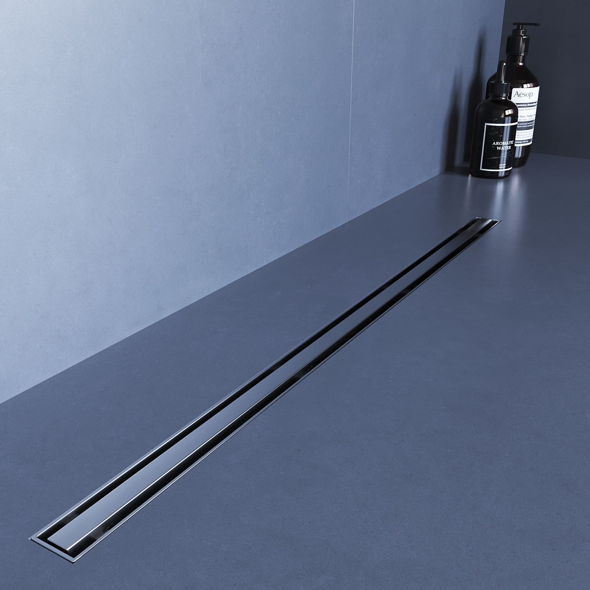 Узкая линия стальной крышки, удобно закрывающая сливную систему, практически незаметная в дизайне интерьера, при этом сбор воды идет в широкий по своей форме лоток и далее через сухой затвор в поворотный для универсального подключения сифон;