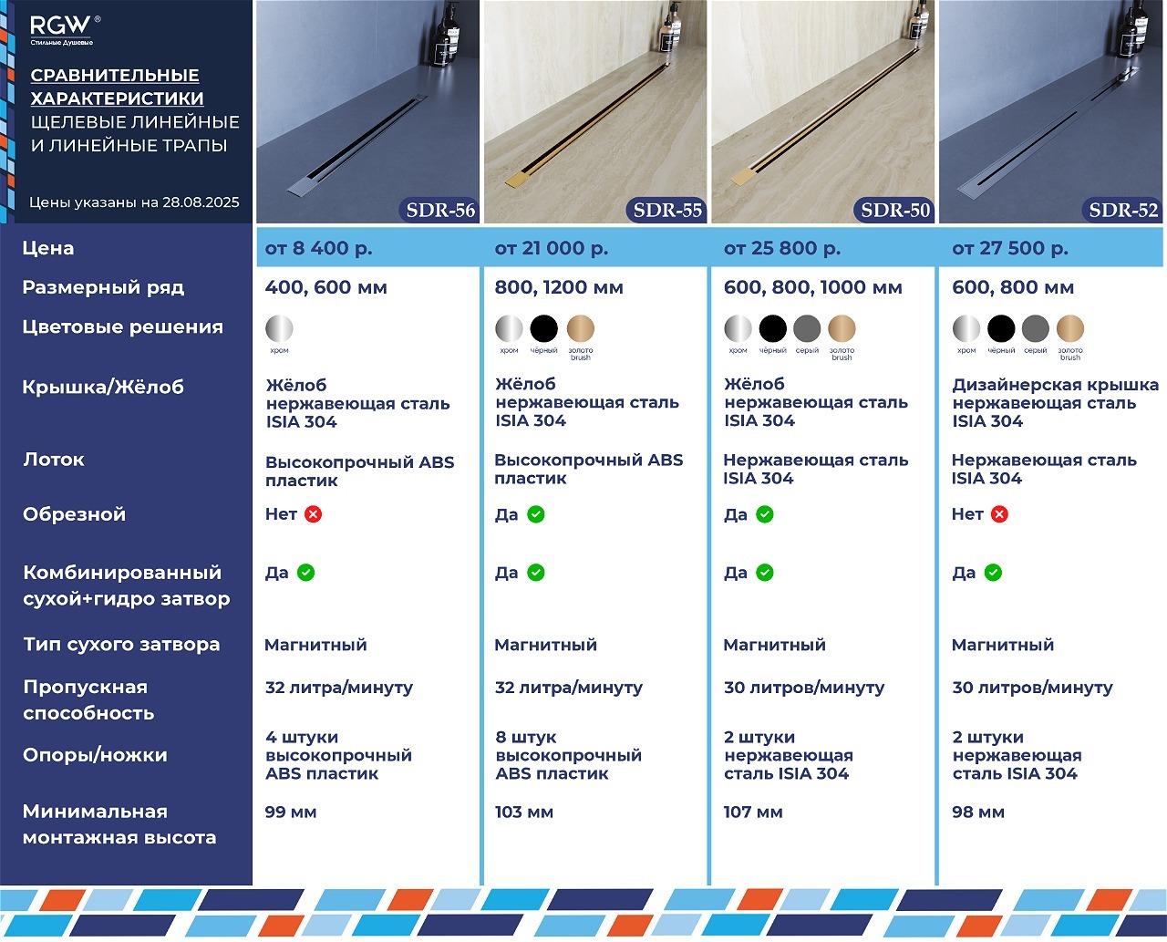 Купить душевой дренажный однолинейный щелевой трап для сбора воды в душевой зоне RGW SDR-56 можно в нашем интернет-магазине по лучшей цене. Также он доступен в магазинах-салонах по всей России и за границей, имеющих дипломы или сертификаты от компании RGW Стильные Душевые. Мы предлагаем широкий ассортимент товаров и удобные способы оплаты. В нашем каталоге вы найдете профессиональные советы по характеристикам, отзывам и рейтингу изделий.