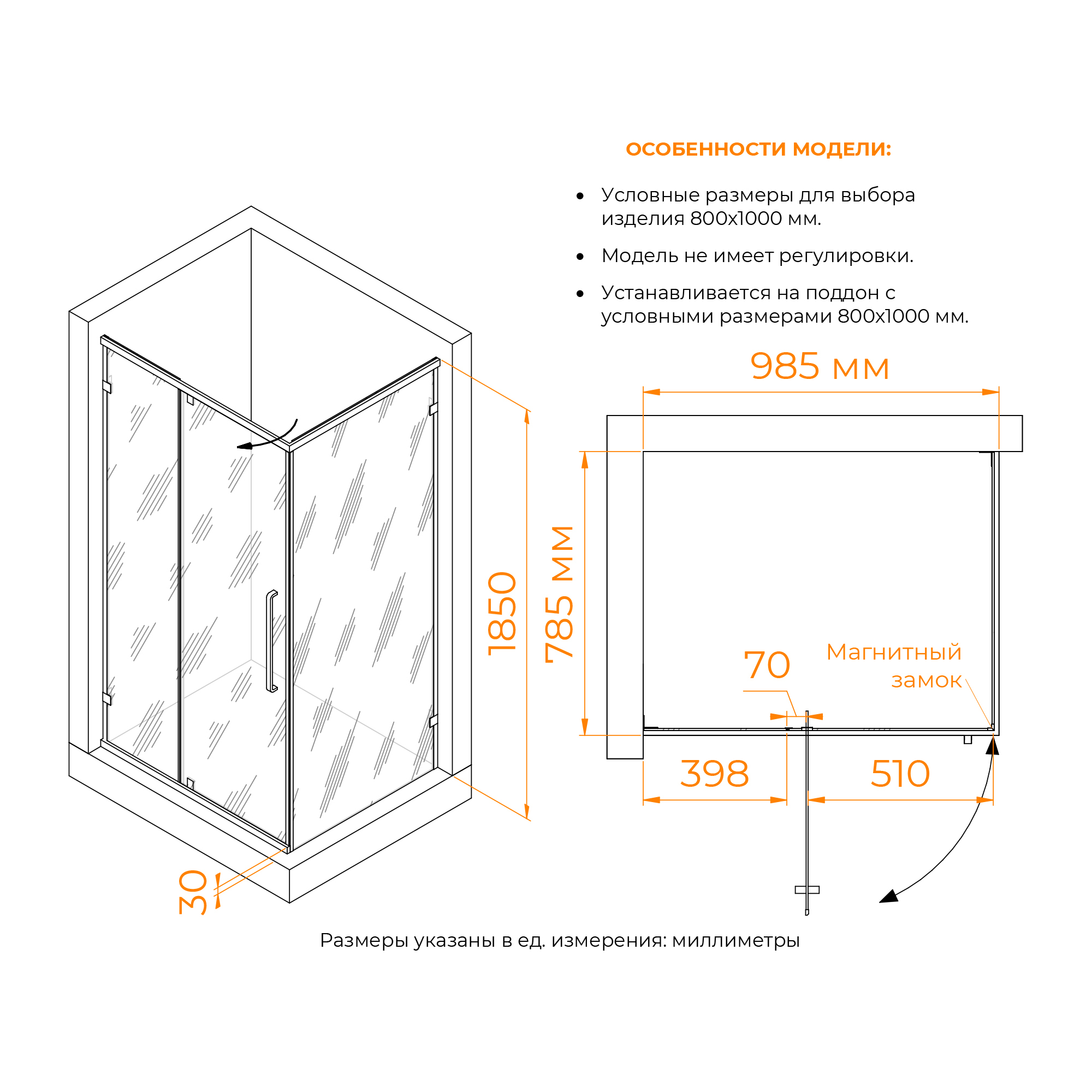Модель представлена в чёрном исполнении профиля и фурнитуры, также обратите внимания, все уплотнители выполнены так же в чёрном цвете, что подчёркивает сдержанную стилистику душевых углов.