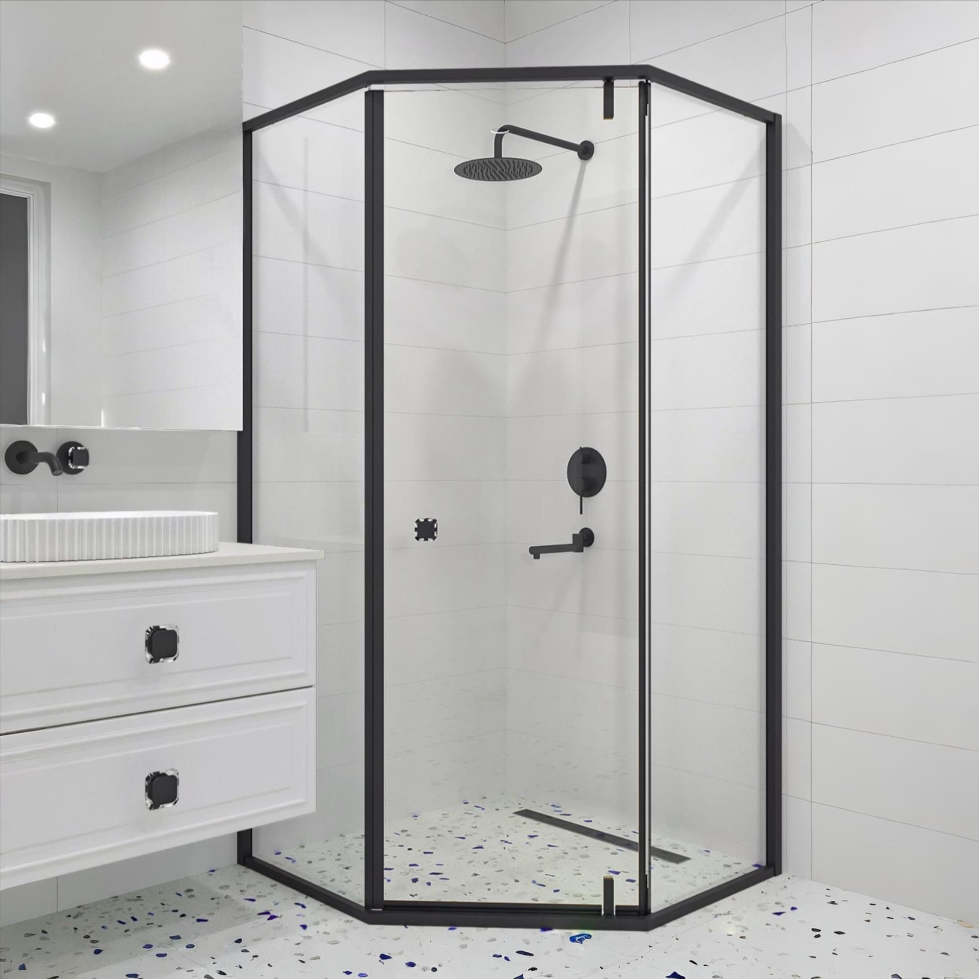 Для описания душевого ограждения мы выбрали термин душевой уголок по форме трапеция не случайно, ведь по геометрической фигуре стёкла выставлены так, что на полу они отображают именно равнобедренную трапецию. Почему назвали душевой уголок «пятиугольный», потому что количество углов в этой кабине будет пять.
