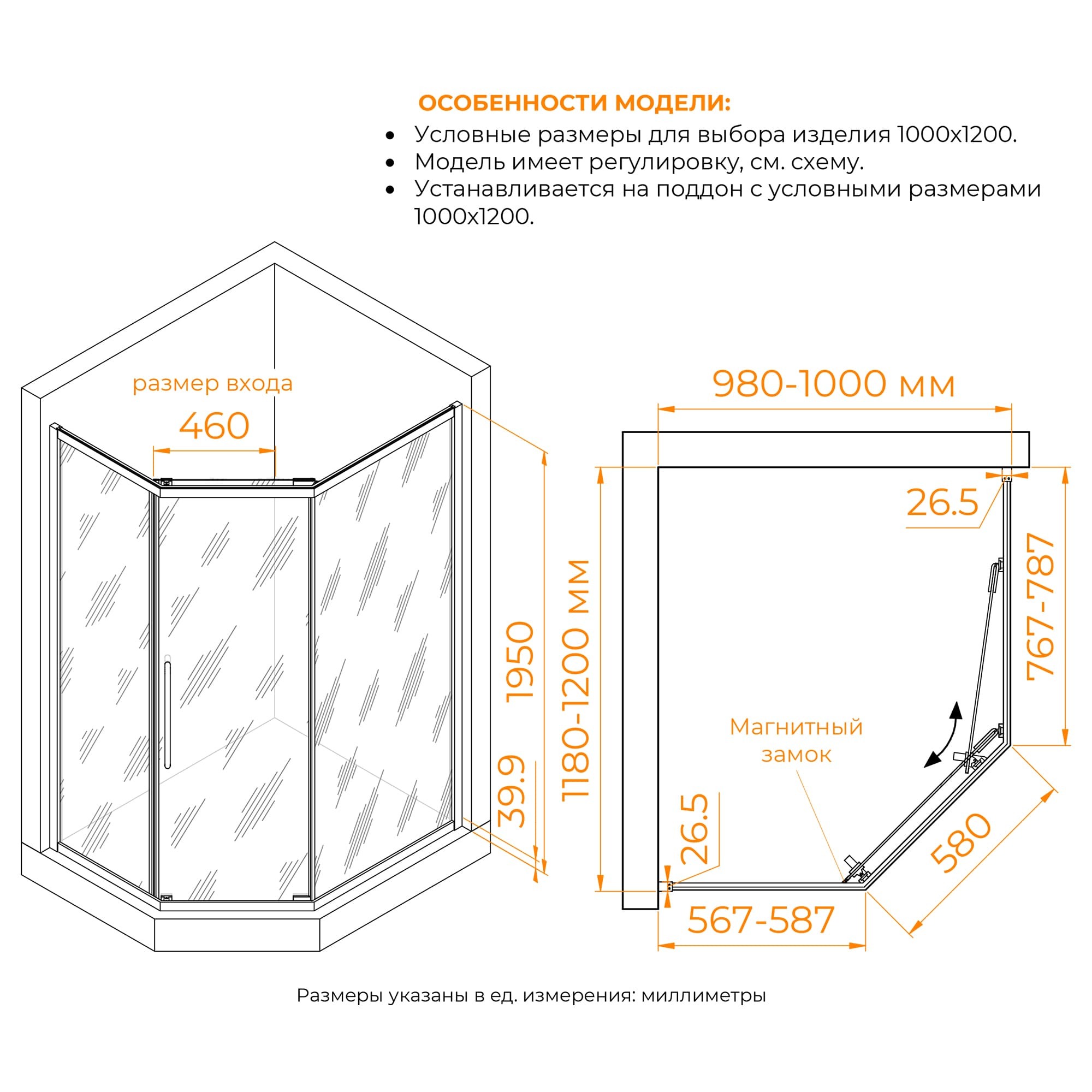 Форма душевого угла RGW PA-86 асимметричная трапеция, что позволяет идеально вписаться в эстетику вашей ванной комнаты. Эта форма обеспечивает максимальное использование доступного пространства душевой зоны и создает комфортное ощущение простора.