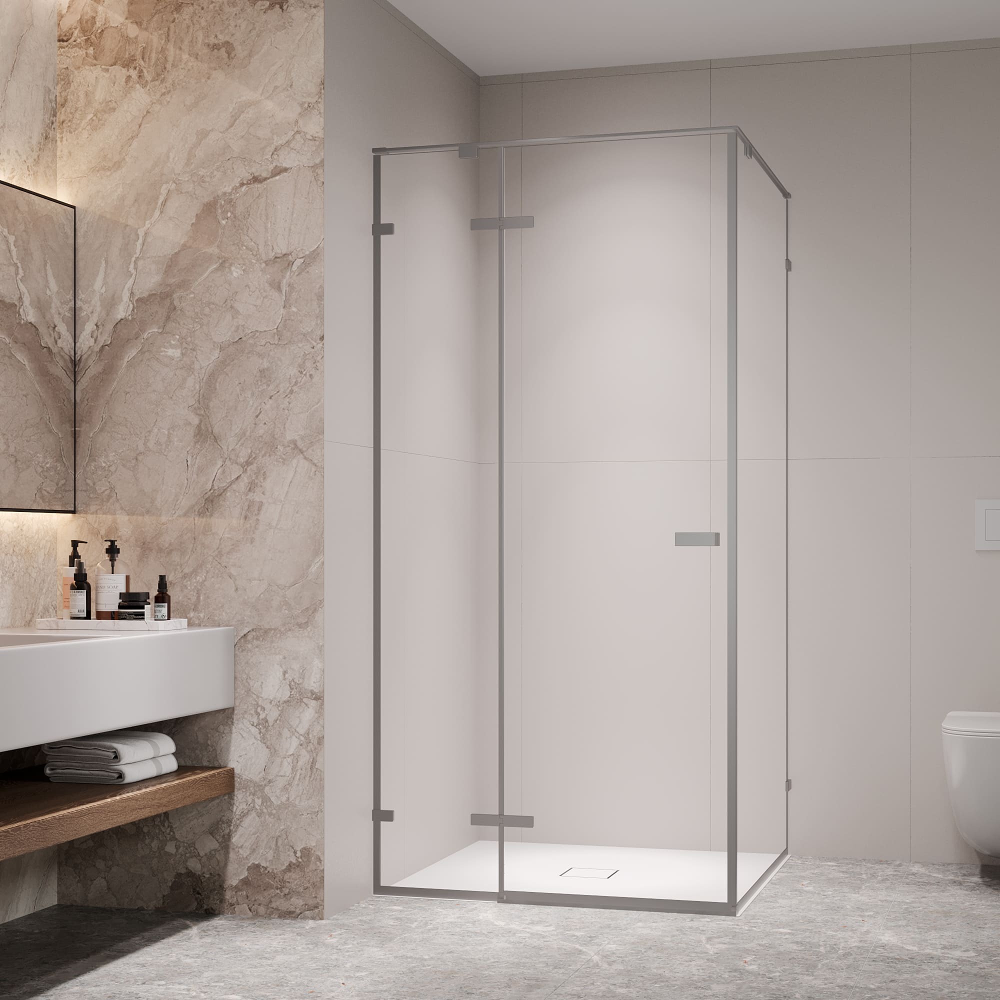 Каждый душевой угол изготовлен из высокопрочного закалённого стекла толщиной 8 мм и оснащён анодированным алюминиевым профилем ALUSTRONG MAX с усиленными коннекторами, что гарантирует надёжность и премиальный вид.