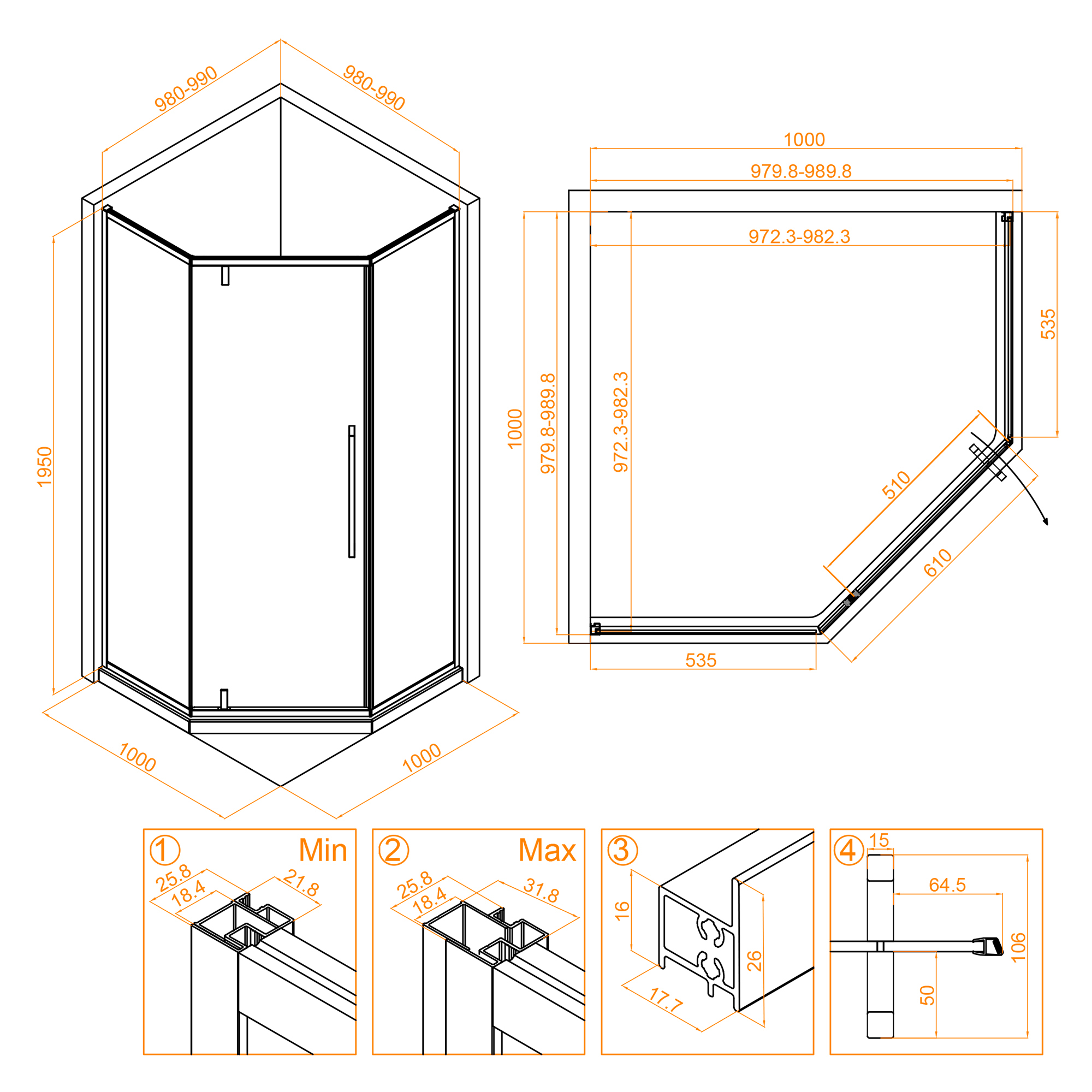 Основное преимущество данного душевого уголка – это его толщина стекла 6 мм, что обеспечивает высокую прочность и долговечность конструкции. Размеры душевого уголка – трапеция, его высота составляет 1950 мм, что позволяет легко поместиться внутри. Материал профиля – анодированный алюминий в черном цвете, что гармонично подчеркивает дизайн и придает углуоку роскошный внешний вид.