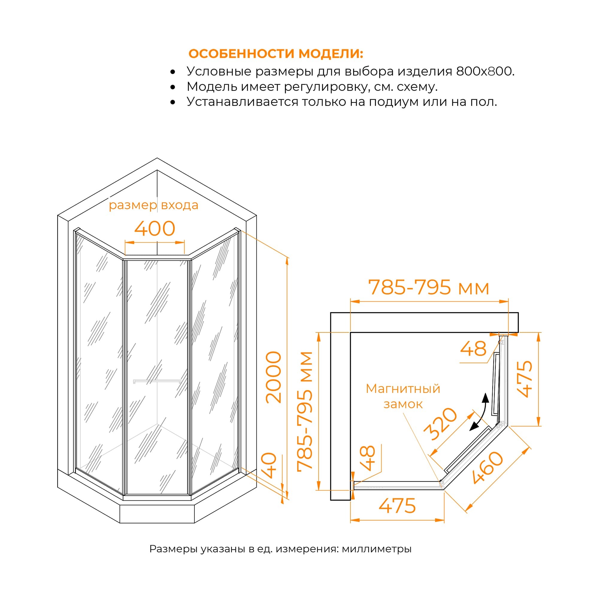 Изделия можно установить, как на плитку с трапом так и на поддон соответствующего размера. (с поддоном стандартного размера не совместим (см. схему изделия)