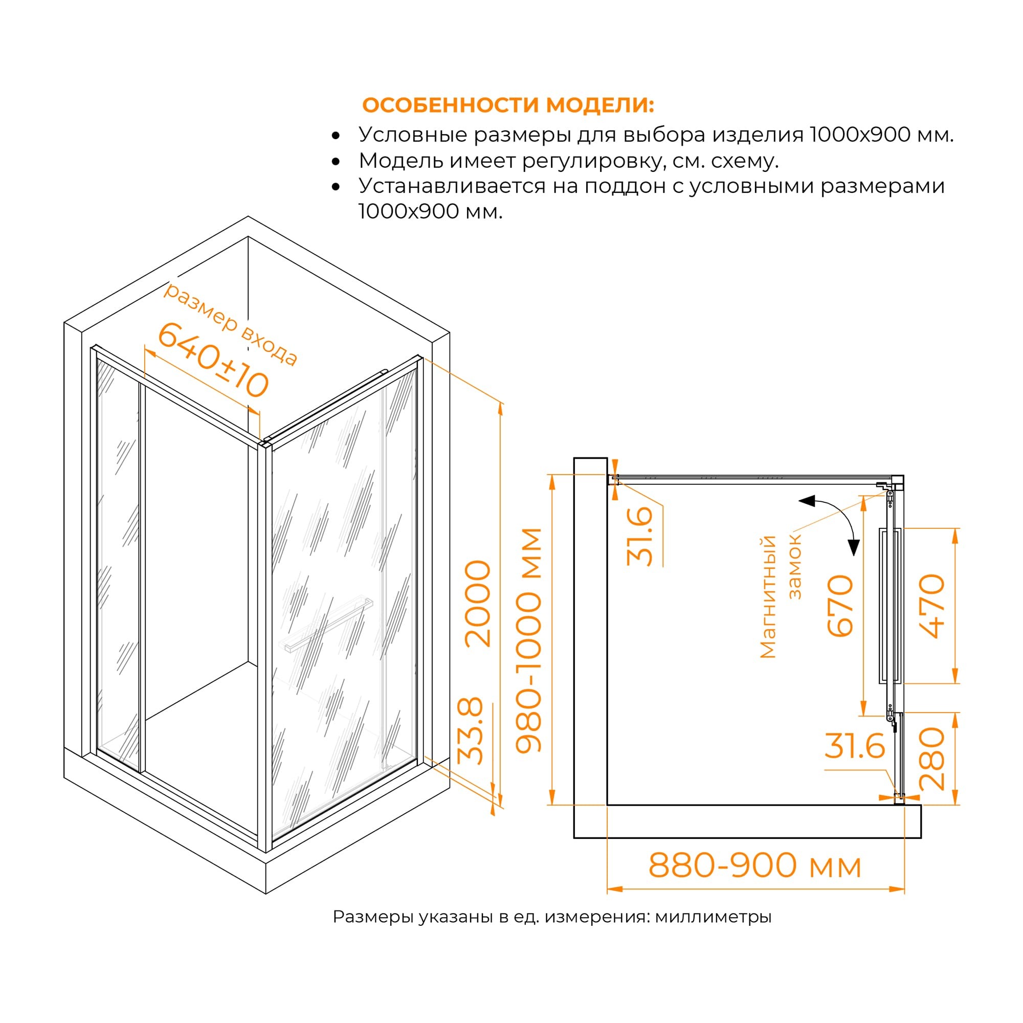 Прямоугольный угол образуют три стекла - два стационарных полотна и одно полотно «Дверь», которое при нажатии на дверную ручку плавно толкает дверное полотно вовнутрь душевой зоны к боковому стационарному стеклу. Магнитный замок, вмонтированный в профиль двери, качественно герметизирует вход.