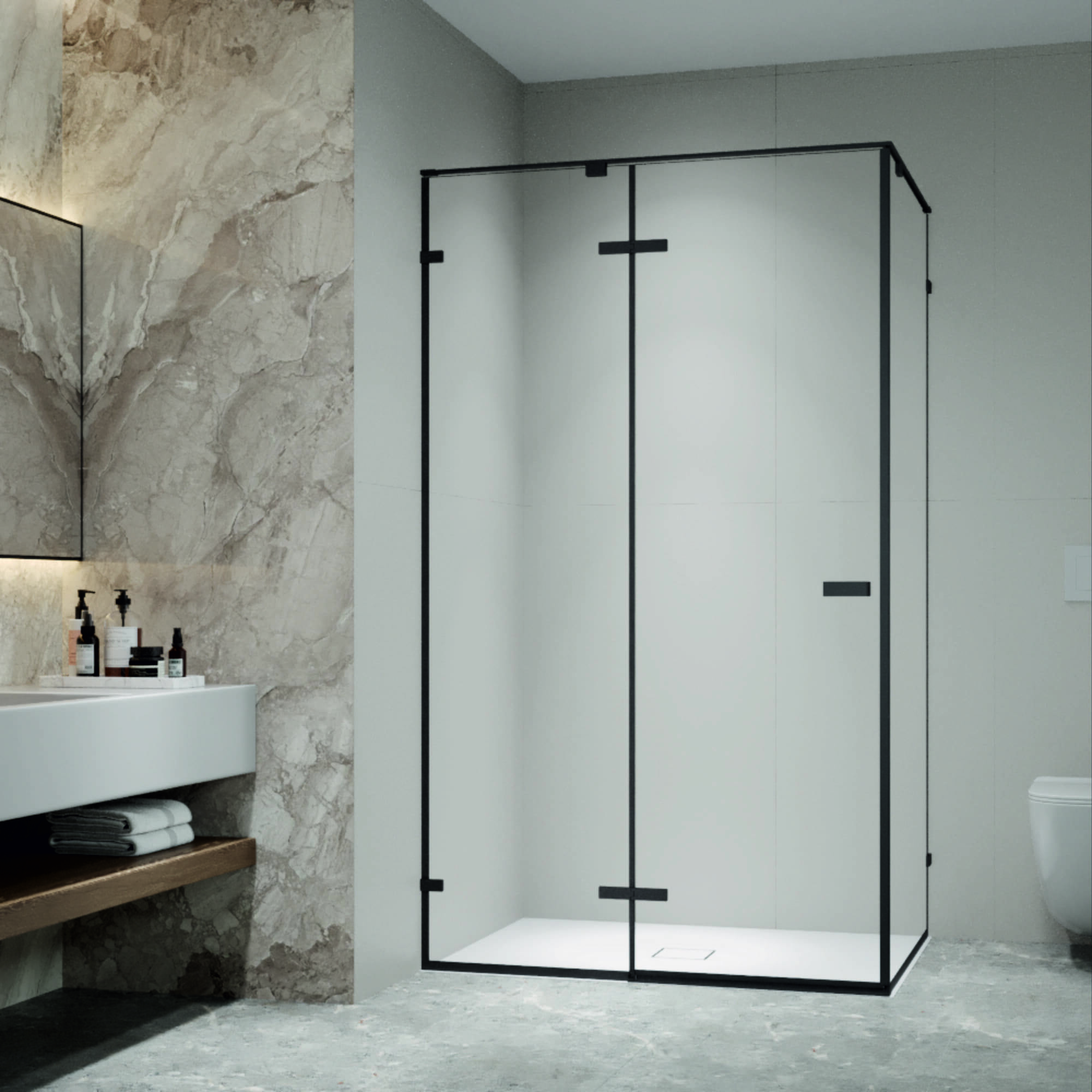 ОГРАЖДЕНИЕ из стекла 8 мм, в алюминиевом каркасе. Имеет пристенный профиль, коннекторы для крепления стекла, петли без подрезки из алюминия, распашную дверь во внешнее пространство душевого угла. При установке, душевой уголок за счет боковых профилей крепится к стенам, которые предварительно облицованы керамической плиткой, герметично закрывая мокрую зону, тем самым образует душевую кабину сборного типа. Душевая кабина сборная с угла - прекрасная альтернатива любой ванне.