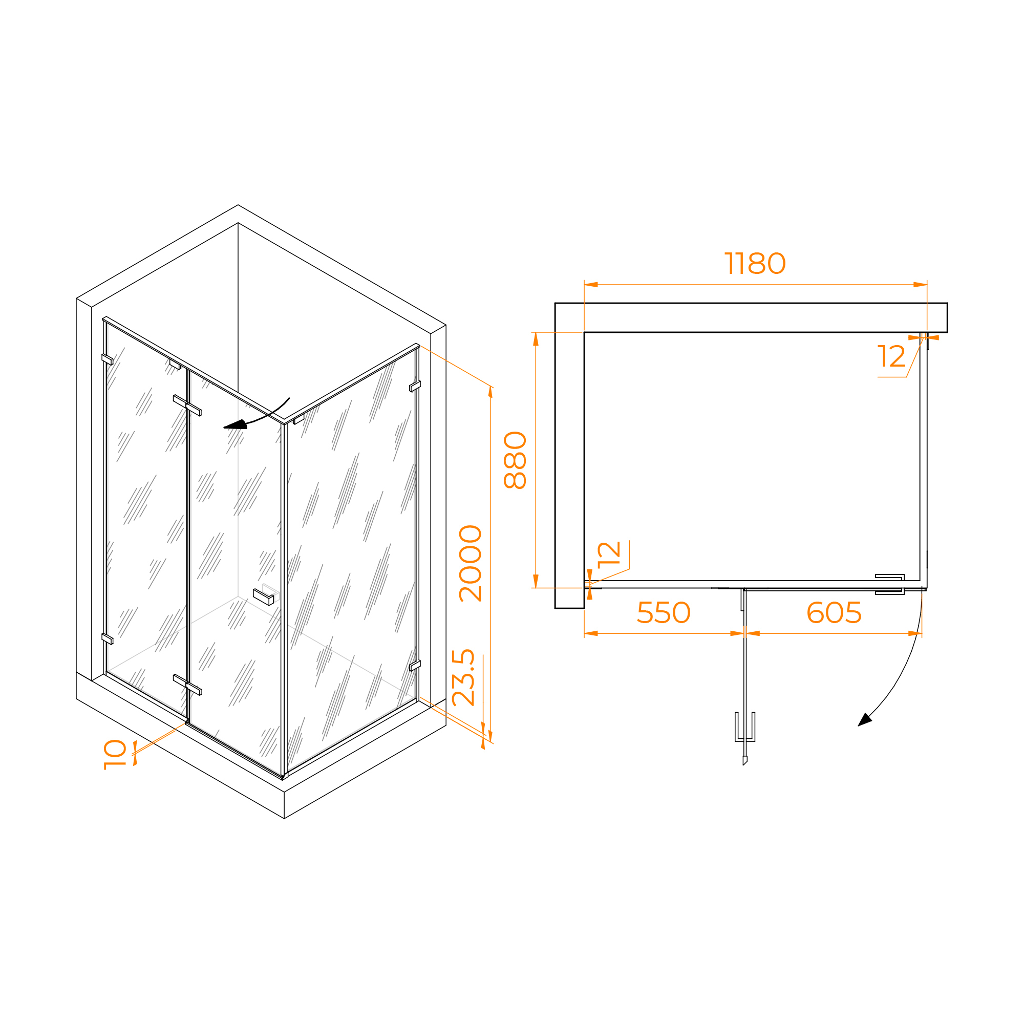 ОГРАЖДЕНИЕ из стекла 8 мм, в алюминиевом каркасе. Имеет пристенный профиль, коннекторы для крепления стекла, петли без подрезки из алюминия, распашную дверь во внешнее пространство душевого угла. При установке, душевой уголок за счет боковых профилей крепится к стенам, которые предварительно облицованы керамической плиткой, герметично закрывая мокрую зону, тем самым образует душевую кабину сборного типа. Душевая кабина сборная с угла - прекрасная альтернатива любой ванне.