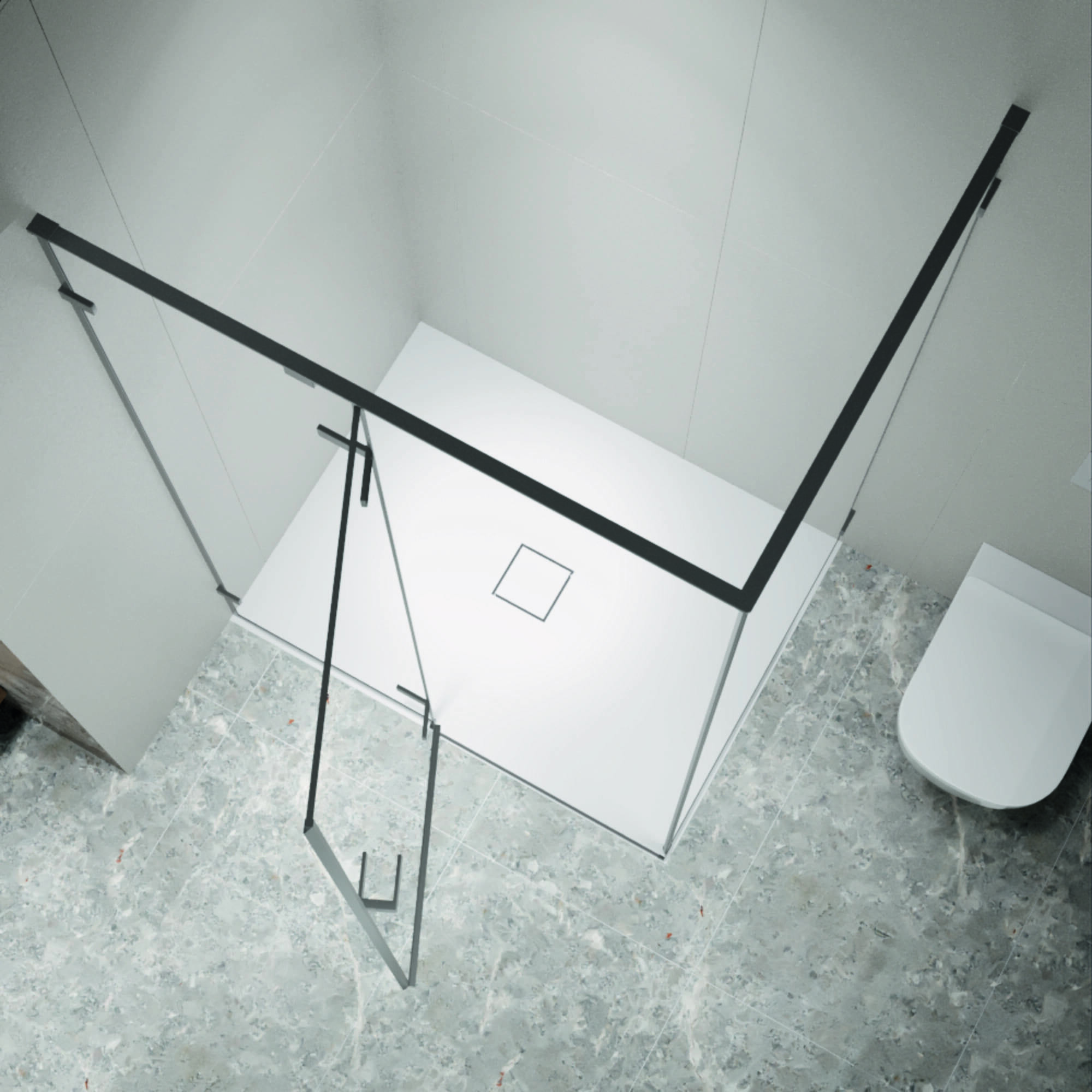 Душевой уголок состоит из трех полотен стекла - два стационарных полотна и одно полотно «Дверь», которая распахивается на широкий вход, благодаря двум элегантным прямоугольным петлям, типа «стекло-стекло».