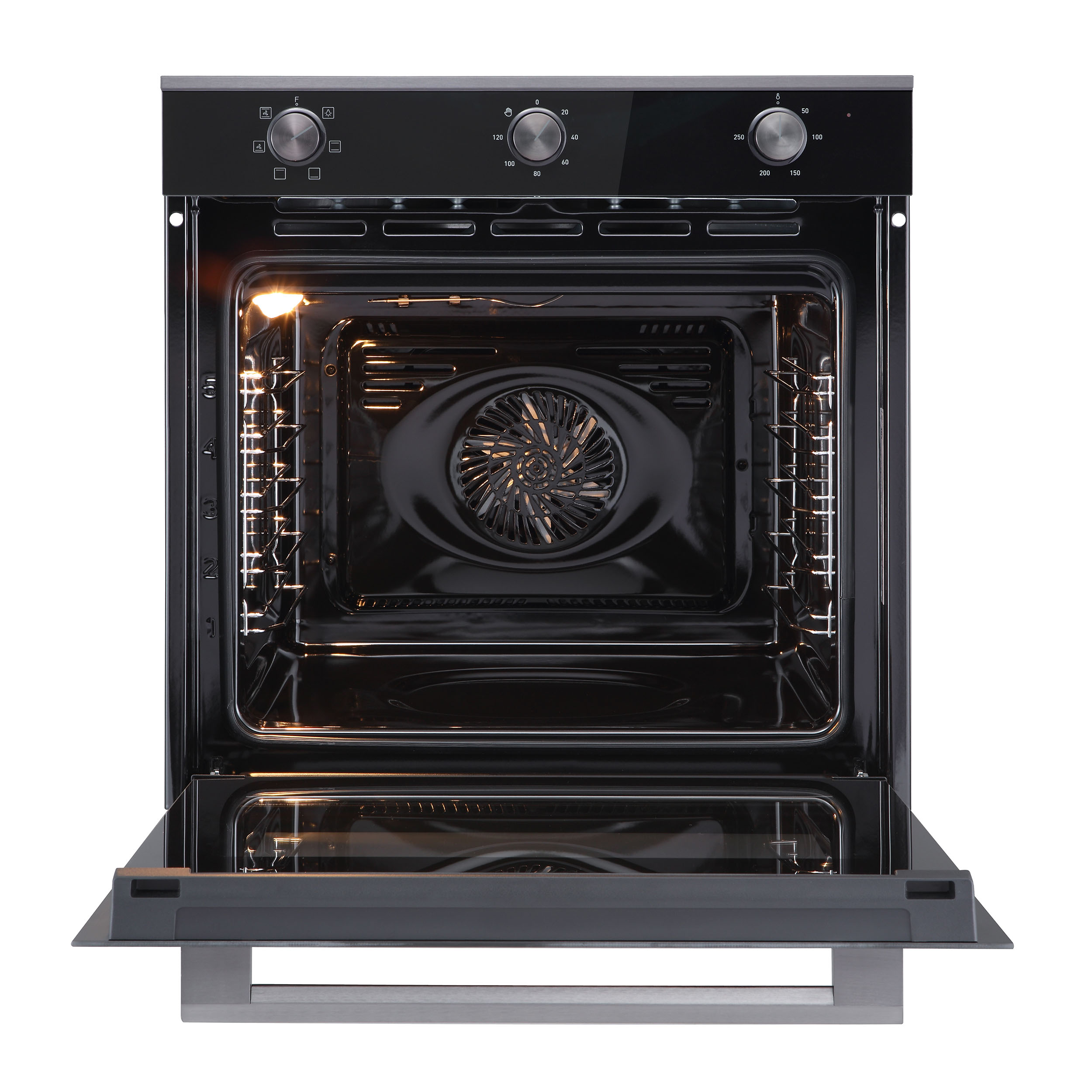 OKB 1310 GNBX Электрический духовой шкаф OKB 1310 GNBX, выполненный в черном цвете и имеющий ширину 60 см, является стильным и современным встраиваемым бытовым прибором. С объемом 72 литра этот духовой шкаф управляется стальными поворотными регуляторами, которые можно утопить в панель управления. При нажатии на регулятор он фиксируется, создавая ровную поверхность, что предотвращает случайные изменения настроек и упрощает процесс уборки. Регуляторы могут быть скрыты даже во время готовки. Модель предлагает шесть различных режимов работы, включая конвекционный и нижний нагрев, размораживание, а также традиционный режим с вентилятором и без него. Особая функция автоматически отключает духовой шкаф, если пользователь забывает это сделать самостоятельно. Система автоматического охлаждения обеспечивает постоянную циркуляцию холодного воздуха, поддерживая низкую температуру боковых стенок, что делает использование прибора безопасным в условиях кухонной мебели. Кроме того, паровая система очистки значительно упрощает уход за духовым шкафом. В комплекте с духовым шкафом поставляются глубокий противень, противень для выпечки и хромированная решетка, что делает его готовым к использованию сразу после установки.