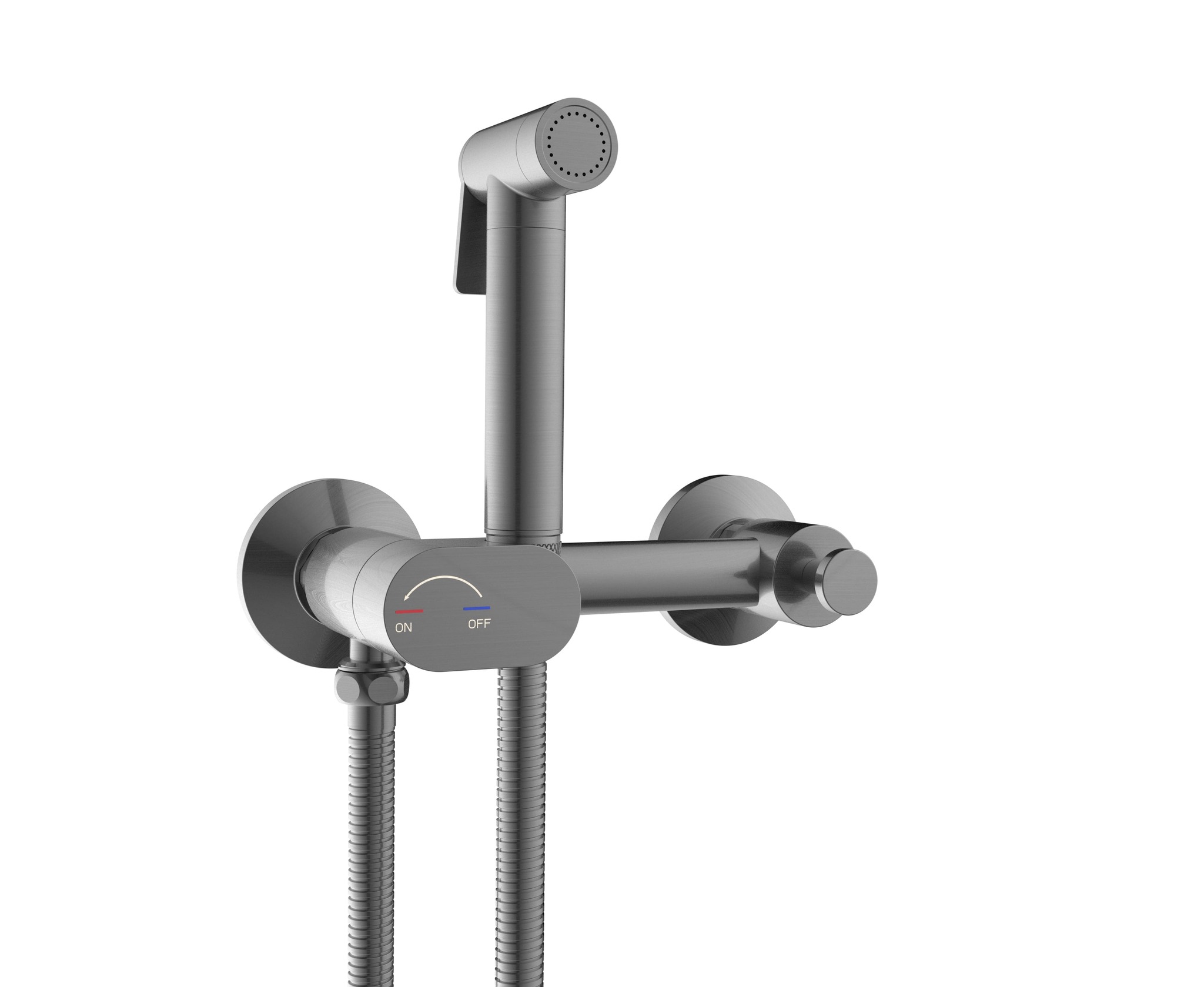 Гигиенический душ в цвете золото Brush (брашированное матовое золото) и серый гигиенический душ — оружейная сталь (вороненная сталь) — краска элементов фурнитуры достигается путем PVD. PVD-покрытие (Physical Vapor Deposition) — это современный метод нанесения тонких износостойких покрытий вакуумным способом.