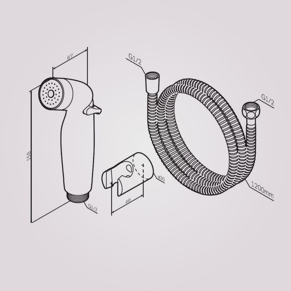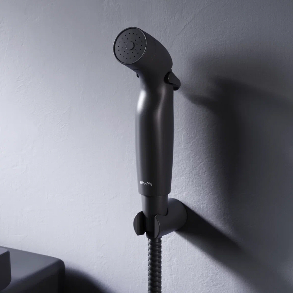 Гигиеническая лейка в комплекте с шланговым подсоединением-держателем и шлангом. Шарнирное соединение защищает душевой шланг от перекручивания. Гибкая конструкция защищенная от изломов и повреждений. Удобная для комфортного использования длина шланга 1200 мм. Трендовый черный матовый цвет ""