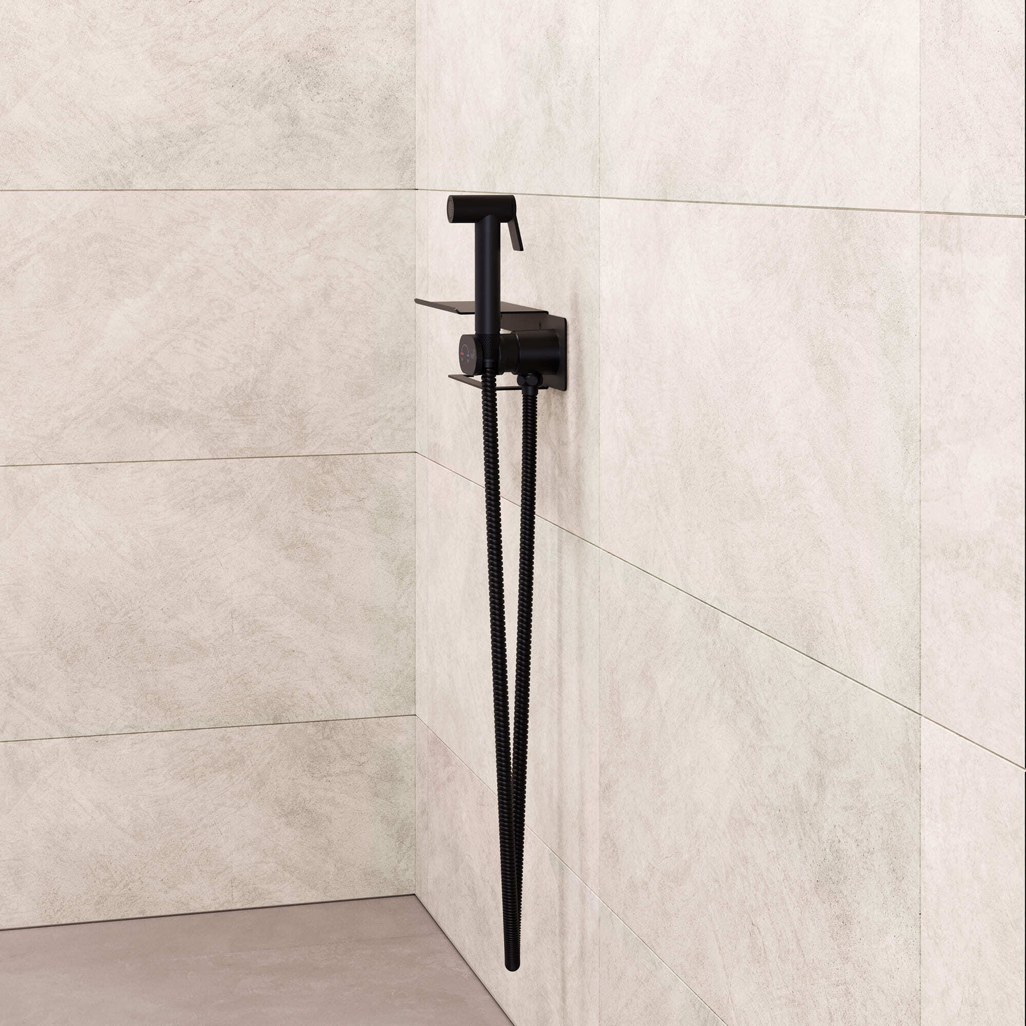 Комплект Гигиенического душа с прогрессивным картриджем, встроенный в стену, черного цвета RGW SP-221B с прогрессивным смесителем для плавного управления температурой (от холодной до горячей) и краном (затвором подачи воды) с держателем лейки --- система «Умная блокировка».