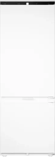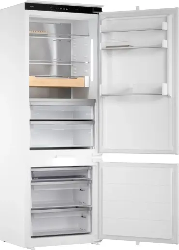 Двухкамерный встраиваемый холодильник RBC597SND1: тихий и вместительный (382 л) с No Frost в обеих камерах, зона свежести 90 л, TFT‑сенсор и суперзаморозка, перевешиваемые двери и LED‑подсветка. Преимущество: экономичный класс A++ снижает потребление электроэнергии.