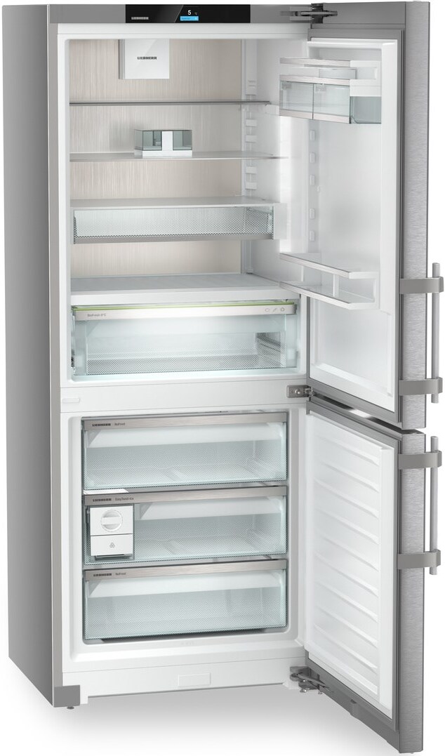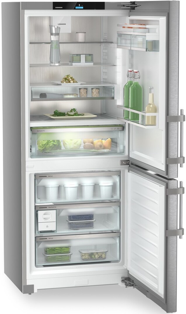 Холодильник Liebherr CBNSDc 765I из серии Prime и линейки BluPerformance – это премиальное решение для хранения продуктов. Серебристый корпус из стали и двери из нержавеющей стали с обработкой SmartSteel против отпечатков пальцев придают ему современный и стильный вид. Вертикальная ручка и светодиодное освещение холодильной камеры добавляют удобства в использовании. С внутренней стороны устройство также впечатляет своими возможностями. Общий полезный объем составляет 410 литров, из которых 282 литра приходятся на холодильную камеру и 128 литров на морозильную. Система размораживания автоматическая, что облегчает уход за устройством. В холодильной камере предусмотрено 5 полок из закаленного стекла, четыре из которых регулируемые. Зона свежести BioFresh и отделение DrySafe помогут сохранить продукты свежими на долгое время.