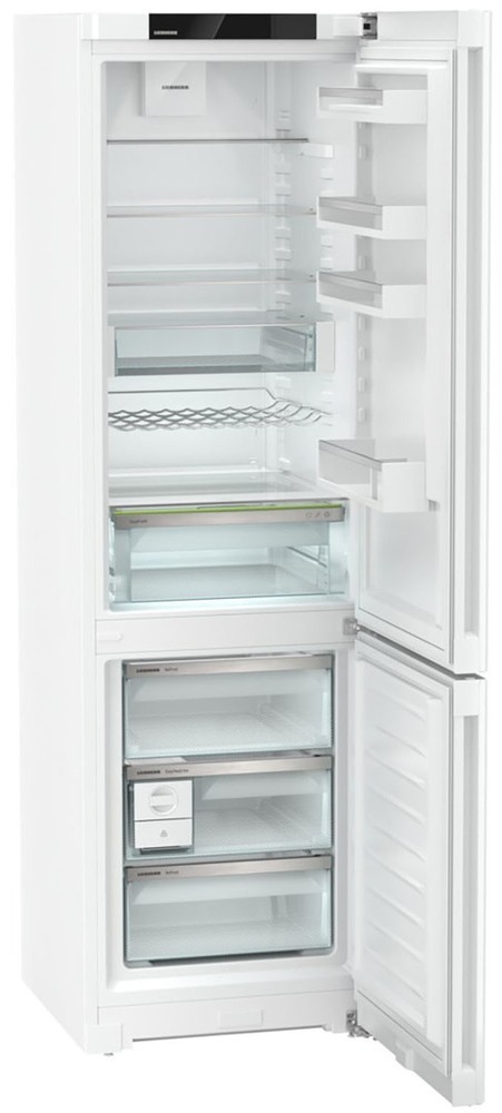 Холодильник Liebherr CNd 5733 оснащен системой NoFrost, она циркулирует холодный воздух в морозильной камере, тем самым не образовывая морозильную шубу на стенках. Специальные раздельные контуры охлаждения DuoCooling не дают воздуху перемещаться между холодильным и морозильным отделениями. Имеется зона свежести для хранения овощей и фруктов, которая сохраняет все полезные свойства продуктов.