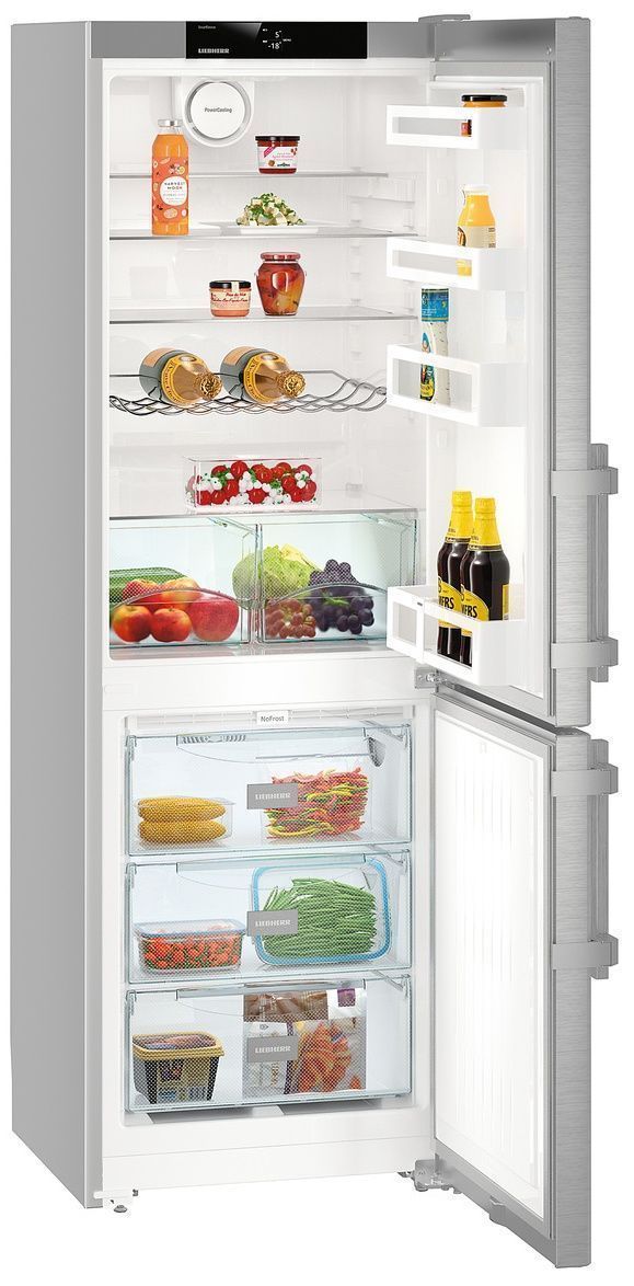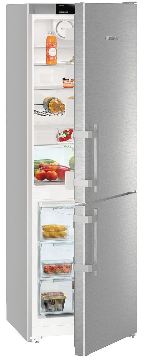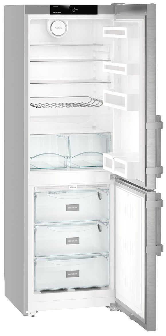 Корпус холодильника Liebherr CNEF 3515 COMFORT NOFROST выполнен из нержавеющей стали, дверца имеет специальное покрытие SmartSteel с обработкой против отпечатков пальцев. Ручка алюминиевая со встроенным механизмом открывания. Класс энергопотребления E (старое обозначение — А ++) сокращает расход электричества на 20% по сравнению с аналогами класса A. Уровень шума равен 39 дБ и не доставляет дискомфорта своему обладателю. Электронное управление, осуществляемое по средствам сенсорных переключателей, простое и понятное. 2.4-дюймовый монохромный TFT-дисплей отображает всю необходимую информацию о работе. Светодиодное освещение расположено вверху и обладает увеличенным сроком службы и повышенной яркостью. Упор двери находится справа, но ее можно навесить с нужной вам стороны, что позволяет без труда вписаться в любой готовый кухонный интерьер. Полезный объем холодильной камеры равен 221 л. Система размораживания автоматическая, однако для уборки прибор следует отключать один или два раза в год. Циркуляционное охлаждение PowerCooling способствует поддержанию идеального микроклимата. Полки выполнены из закаленного стекла, три из четырех можно отрегулировать по высоте по вашему усмотрению. Внутреннее пространство включает: контейнер для фруктов и овощей с роликовой системой, подставку для яиц, универсальную полку для бутылок и отделение для консервов. Гарантия от производителя составляет 24 месяца с даты приобретения.